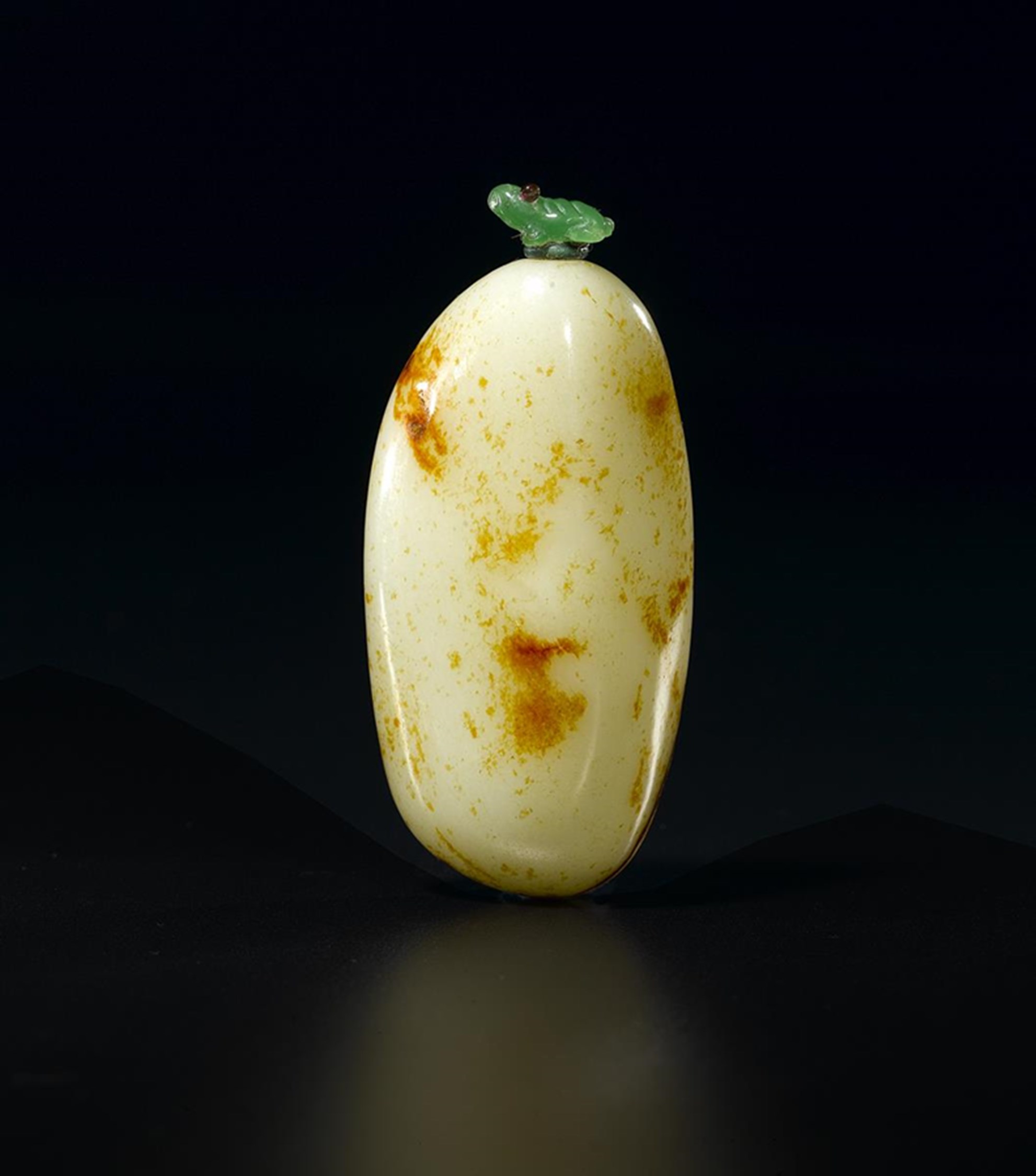 A Chinese pebble jade snuff bottle 19th century, hollowed from a natural stone, the stopper in green glass formed as a frog, 8.5cm.
