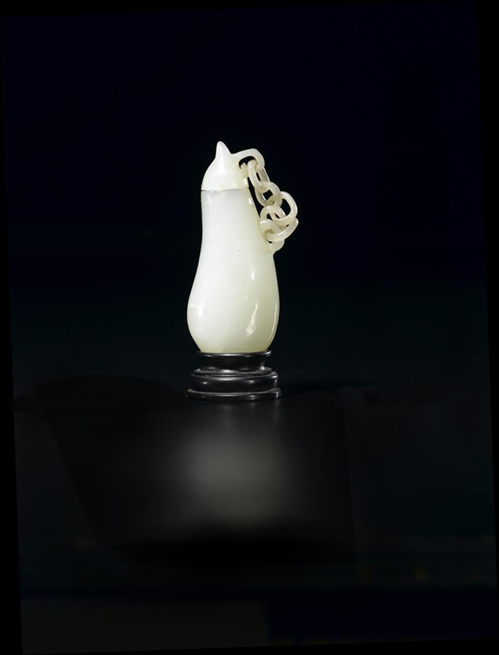 A Chinese small white jade vase and cover 19th century, carved as a gourd, the base and cover joined by a link chain, together with a fitted hardwood stand, 8cm. (2)