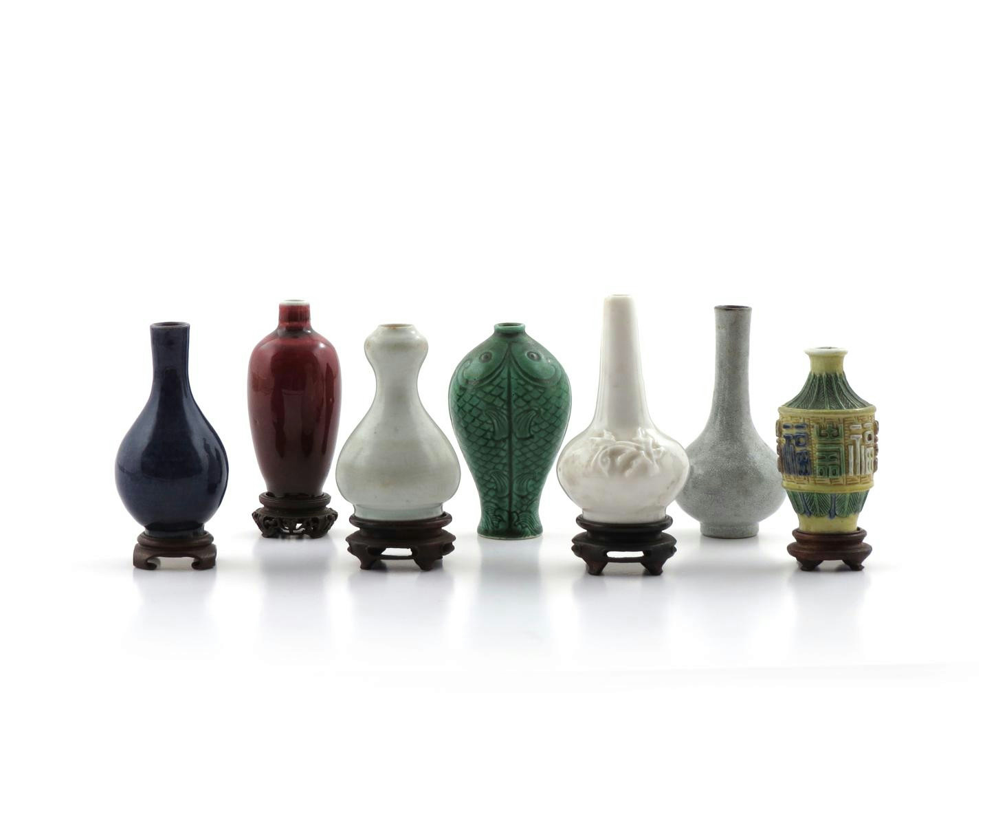 Seven small Chinese vases 18th and 19th centuries, one green glazed and formed as a fish, a four character Chenghua mark to the base, another moulded with Chinese characters within bands of stiff leaves, another garlic-mouthed, incised with shou characters, a six character Yongzheng mark to the base, the fourth moulded in relief with bamboo, five with hardwood stands, one stand with a paper label for John Sparks, 8.5cm max. (12)