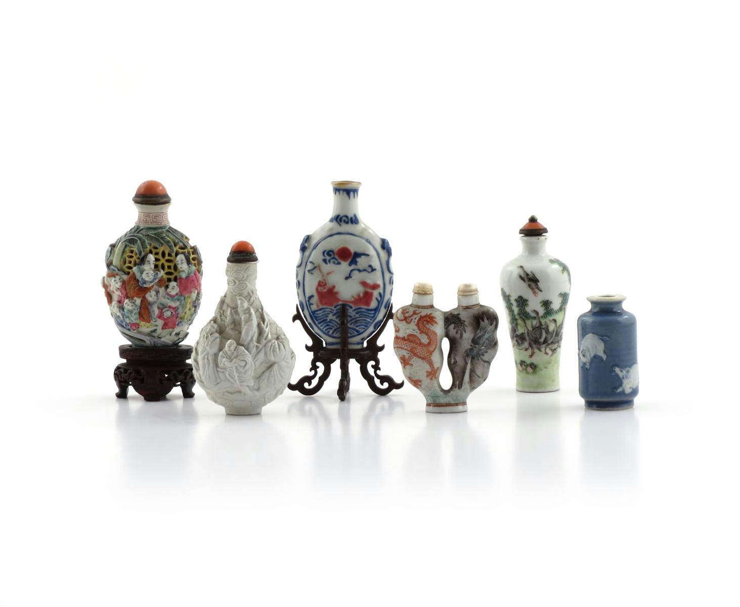 Six Chinese porcelain snuff bottles 19th century, two moulded with figures, one with leaping fish, another with two buffaloes, one painted with geese with a Qianlong mark in blue enamel, and one with dragons, the moulded polychrome bottle with a four character Qianlong mark, the blue bottle marked wan yu, two with wood stands, 9cm. (8)
