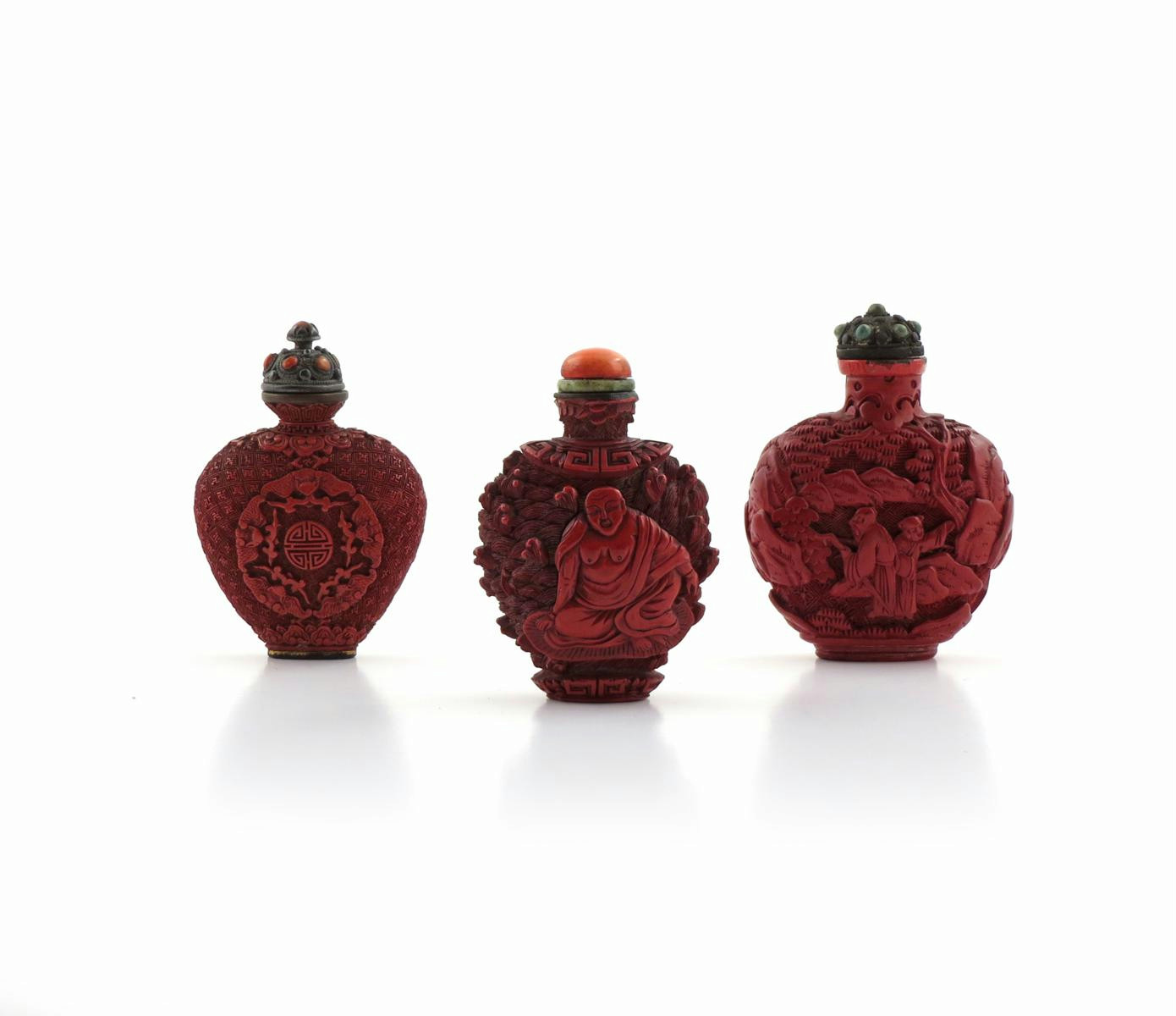 λ Three Chinese red cinnabar lacquer snuff bottles 19th century