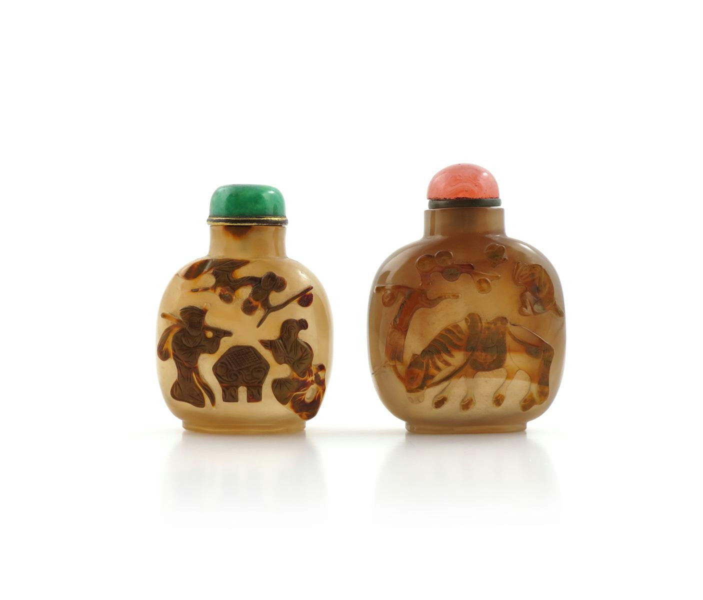 λ Two Chinese agate snuff bottles 19th century, one carved with the Ma shang feng hou symbol of a monkey riding a horse, the other with two figures beneath a prunus branch, the horse's saddle marked with a shou character, 7.8cm. (2)
