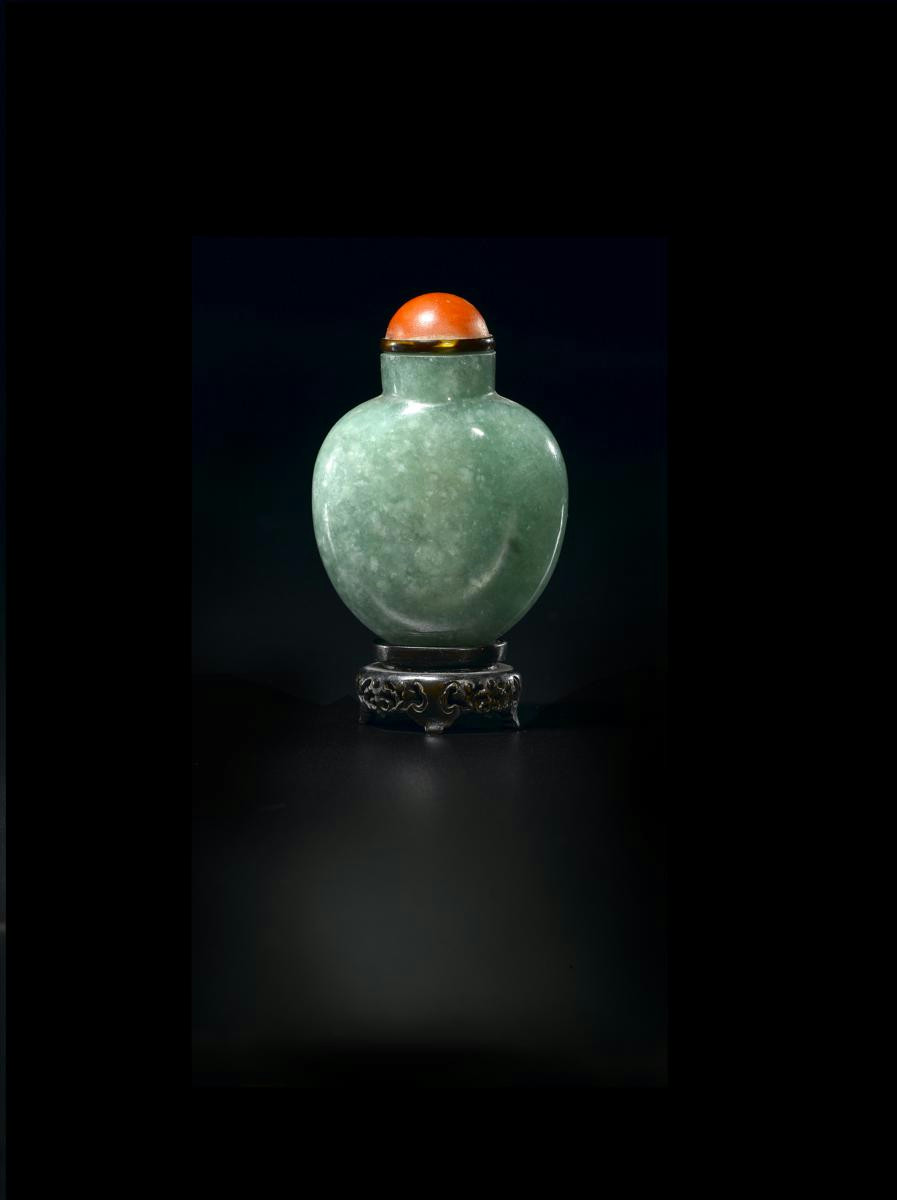 λ A Chinese jadeite snuff bottle 19th century, the ovoid body with a cylindrical neck, the stopper coral, a hardwood stand, 6cm. (2)