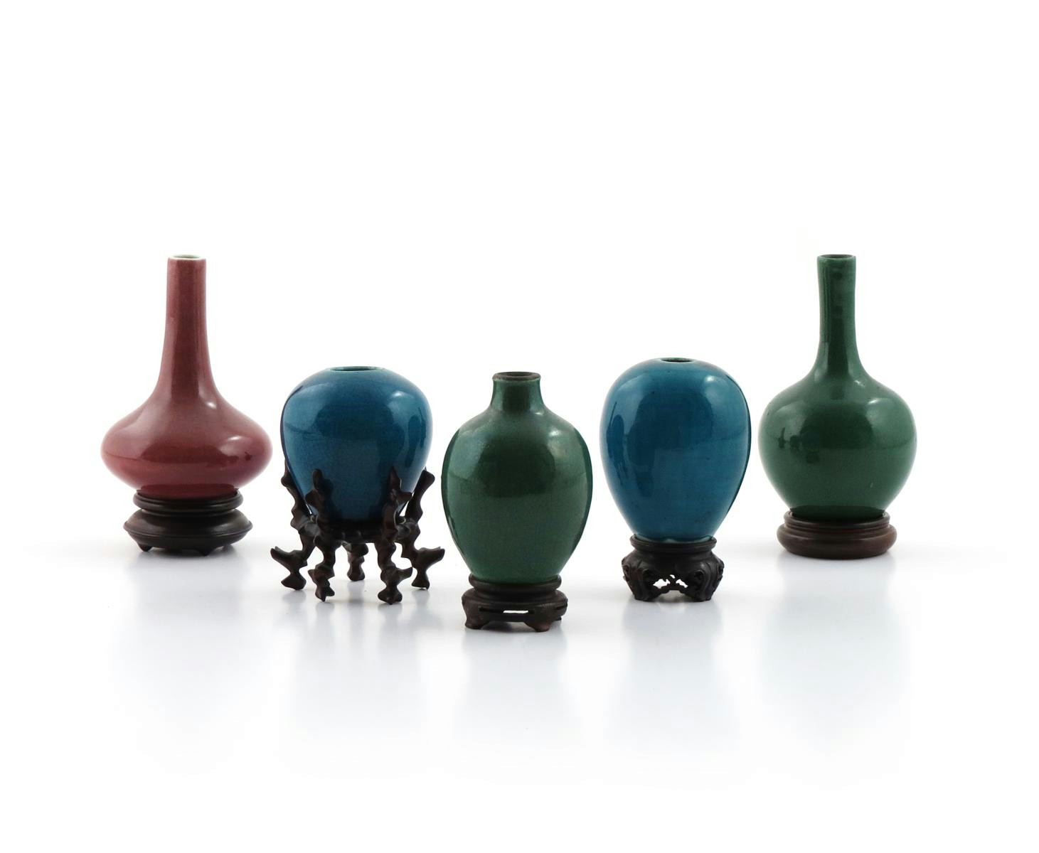 Five small Chinese monochrome vases 18th/19th century, variously formed and decorated in green, turquoise and pink glazes, each with a hardwood stand, 9.6cm. (10)