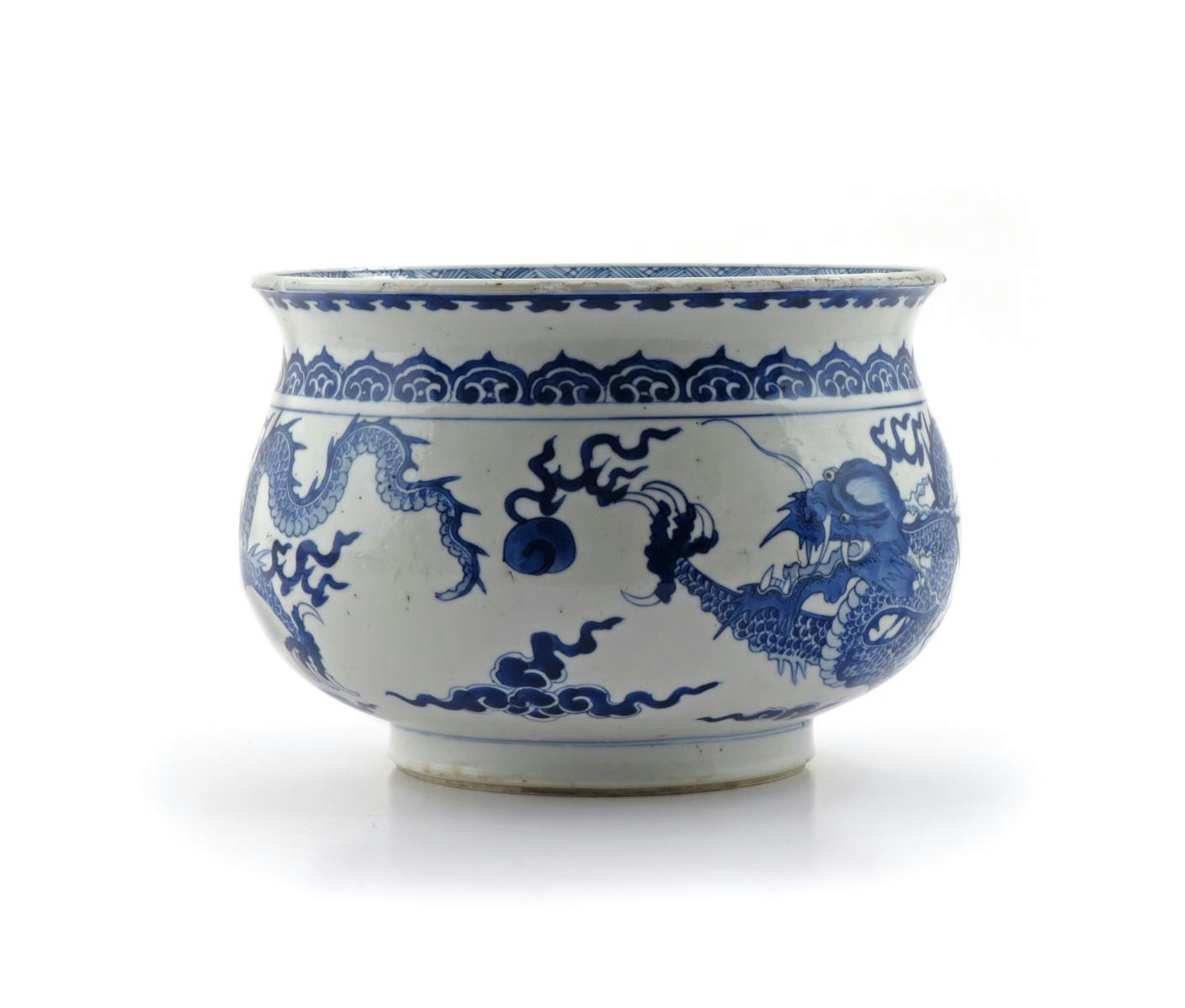 A Chinese blue and white incense burner Kangxi 1662-1722, painted to the exterior with two ferocious scaly dragons and flaming pearls of wisdom amidst cloud scrolls, all beneath a band of ruyi, 22.3cm.