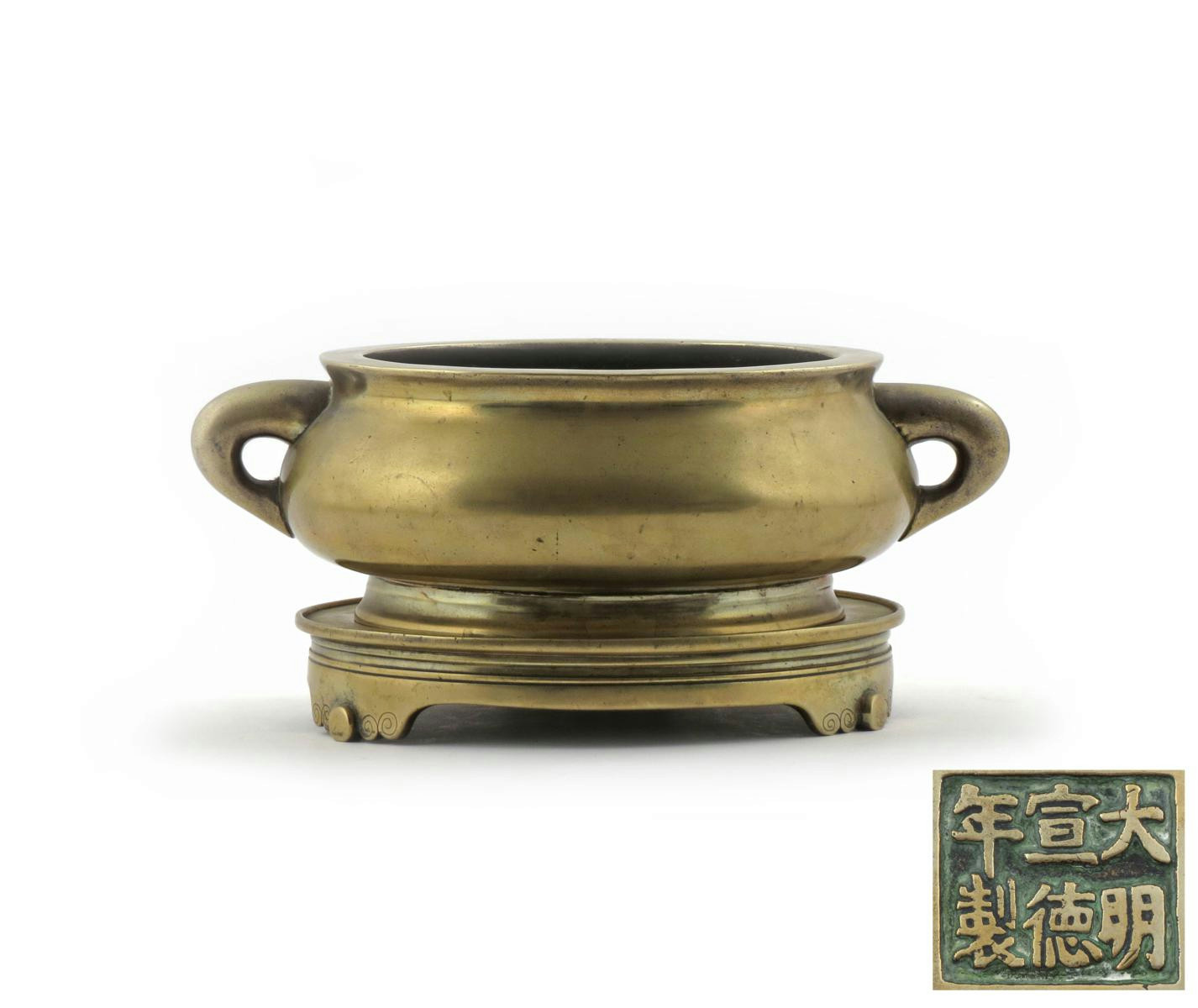 A large Chinese bronze incense burner 19th century, the compressed circular body with loop handles, the base with six character Xuande mark, the stand with three feet decorated with scrolls, 30.5cm. (2)