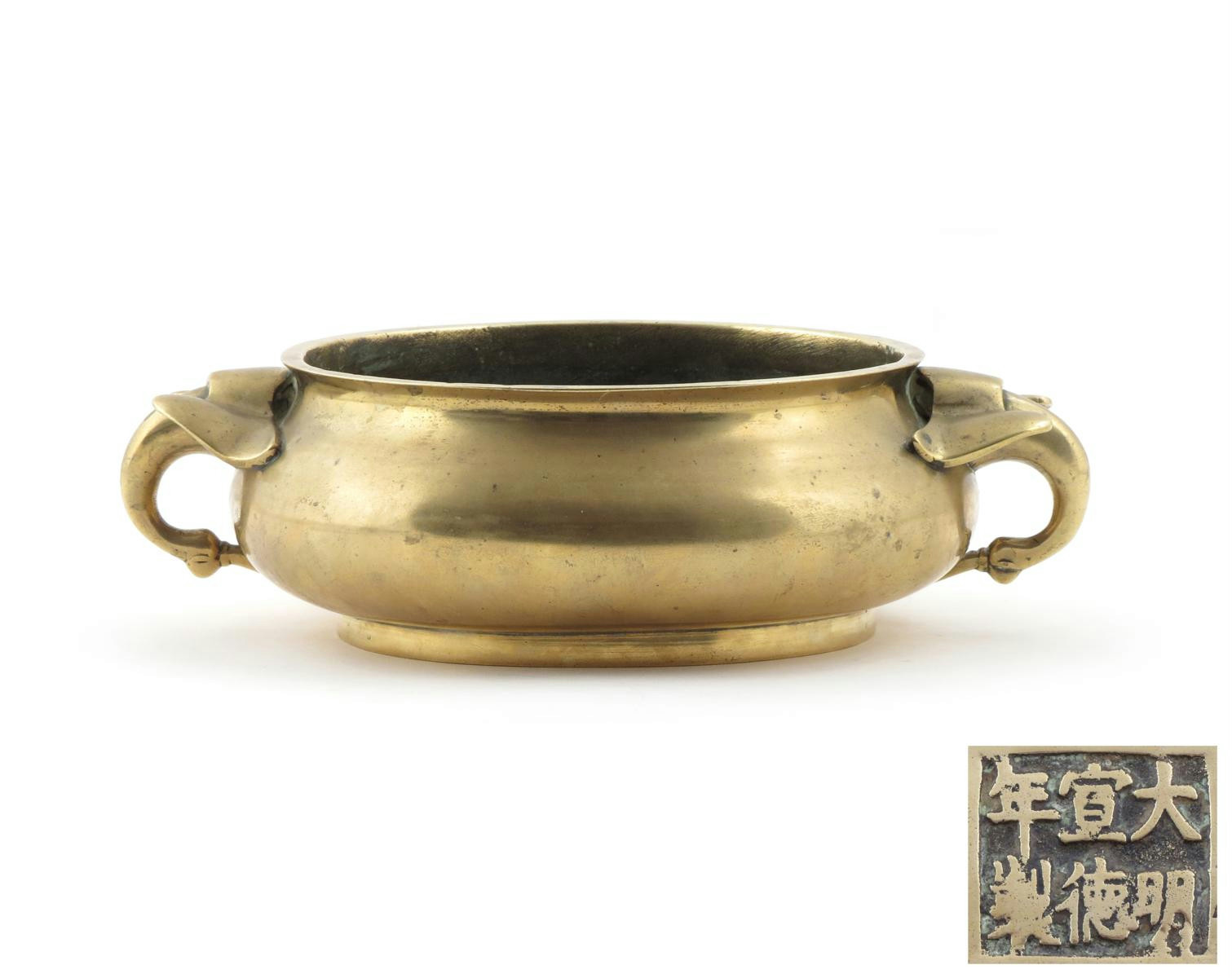 A Chinese gilt bronze incense burner 19th century, with a compressed circular body, the handles in the form of cranes, the base with a six character Xuande mark, 30cm.