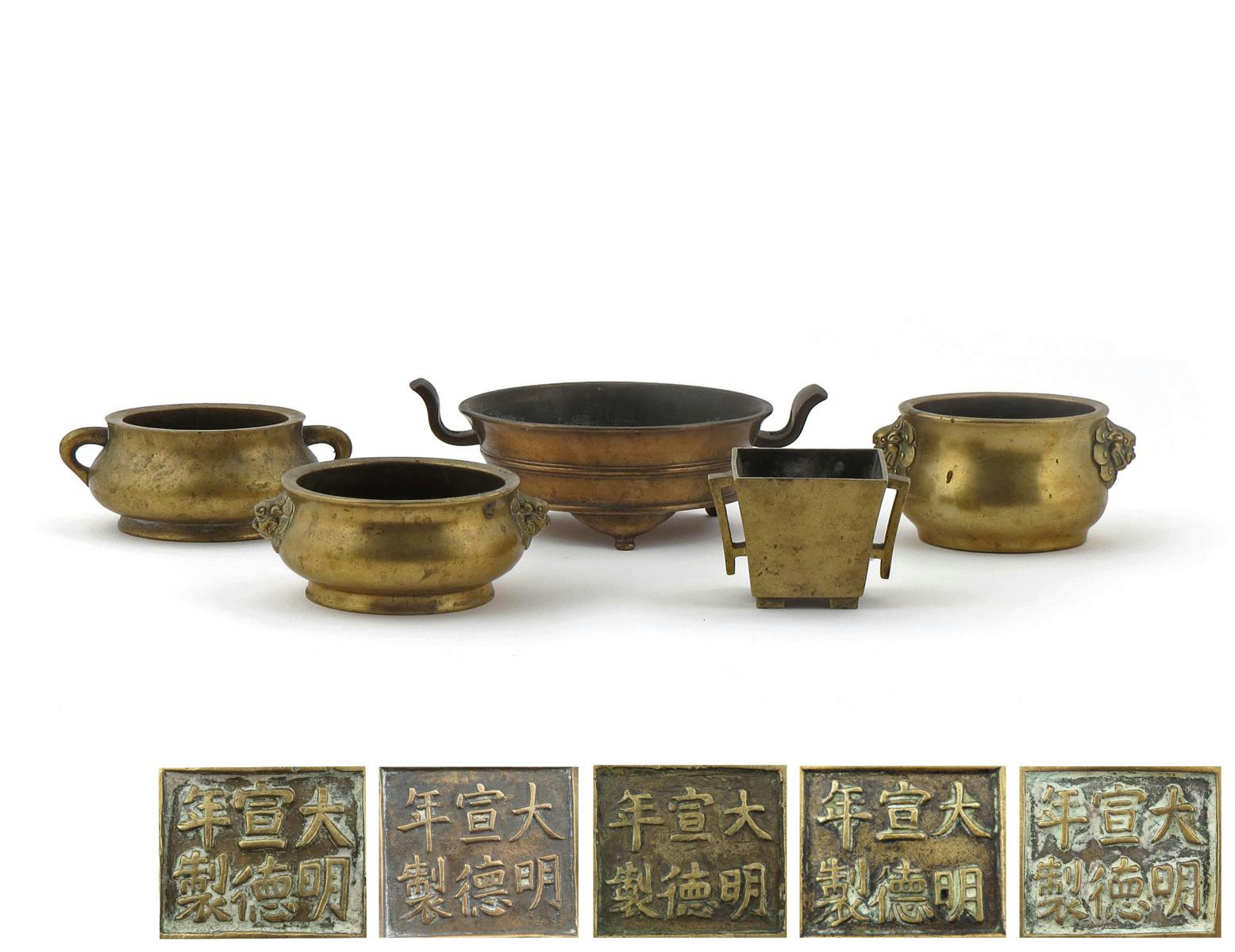 Five Chinese bronze incense burners 19th and 20th centuries, four circular, the fifth square, all with six character Xuande marks, 21.8cm max. (5)