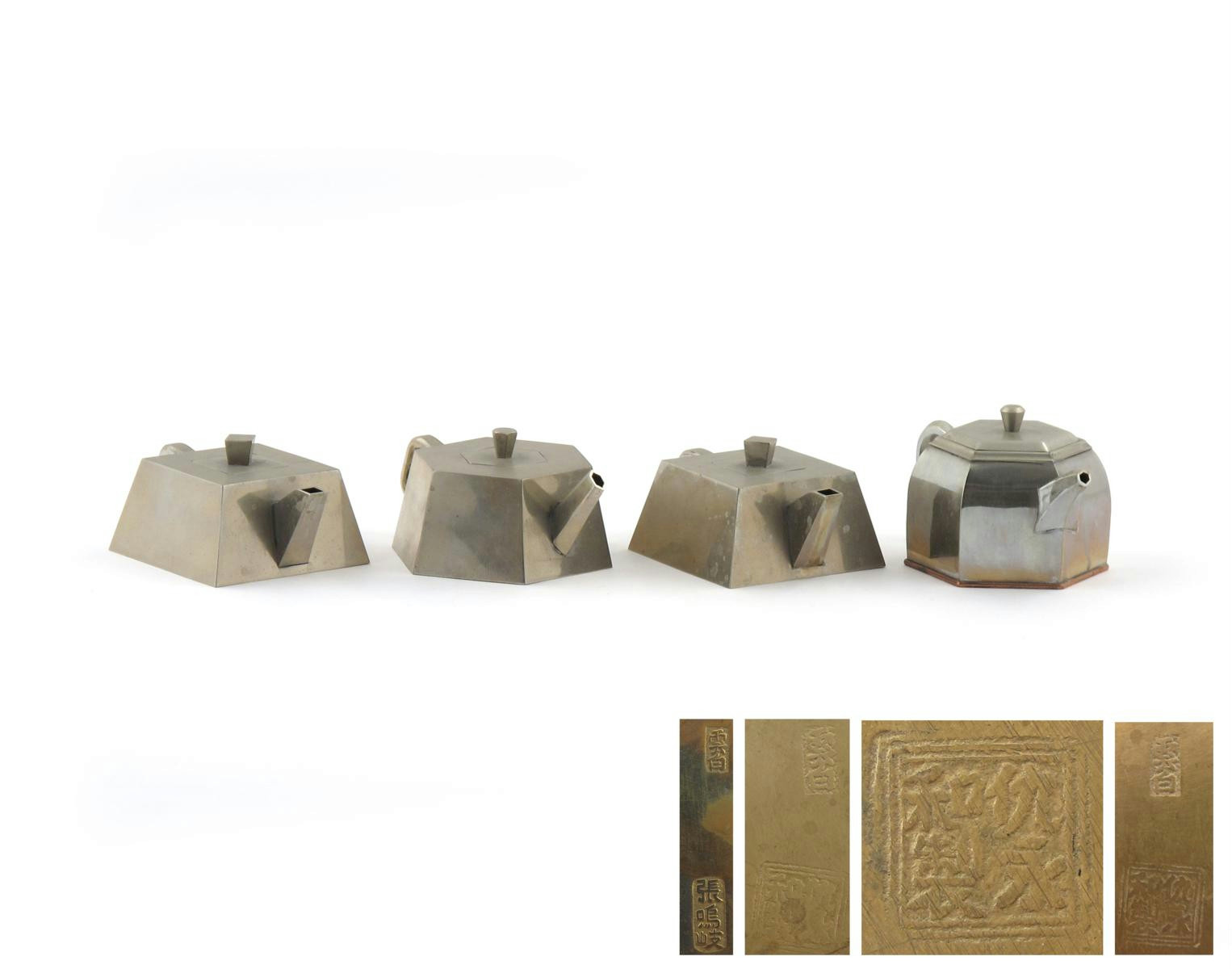 Four Chinese paktong teapots and covers 19th/20th century, two of flared square-section form, the covers with a rhomboid knop, and two hexagonal, each with two impressed marks to the base, 13.5cm max. (8)
