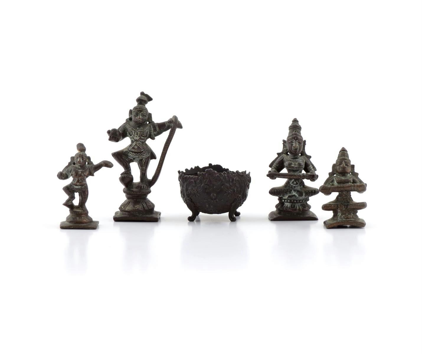 Four small Indian bronze figures 19th century, two depicting Krishna, standing with his right foot resting on a lotus base, celebrating victory over the serpent Kaliya, and two depicting Annapurna, the goddess of nourishment seated with her ladle before her, together with a small bronze bowl, raised on four feet and decorated in relief with birds and animals, 10cm max. (5)