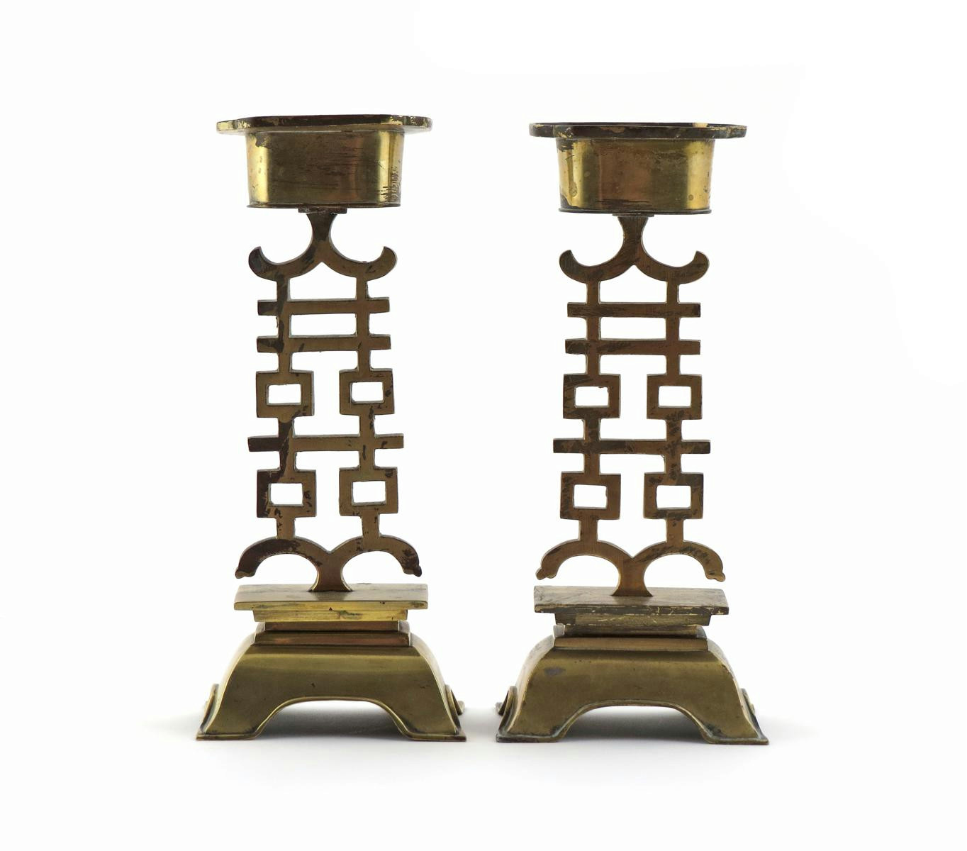 A pair of Chinese gilt bronze candlesticks c.1900, each formed as an openwork shuangxi character, raised on a rectangular domed plinth, 20.1cm. (2)