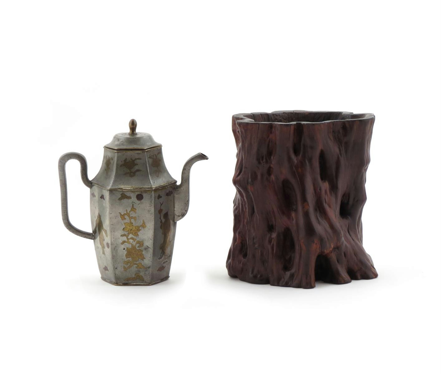 A Chinese pewter hexagonal ewer and cover 19th century, decorated with brass and copper inlay, and a Chinese hardwood bitong, carved from a section of gnarled tree trunk, 19.2cm. (3)