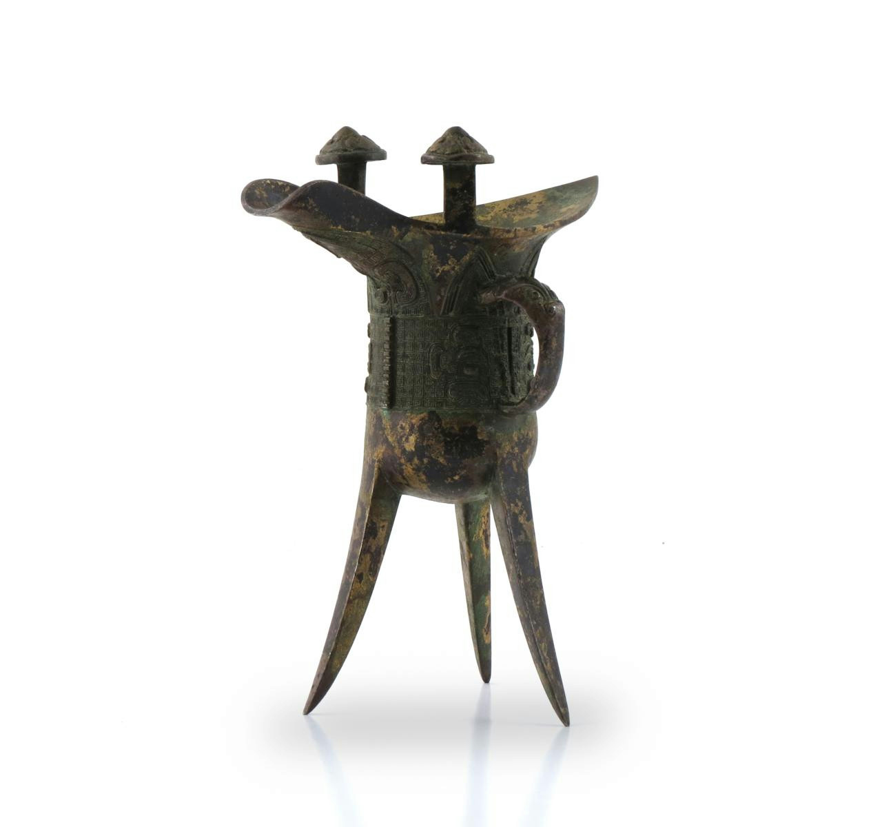 A Chinese bronze vessel, jue 20th century, cast in relief with taotie masks below a band of formal stiff leaves, the body raised on three tapering feet, 20.5cm.