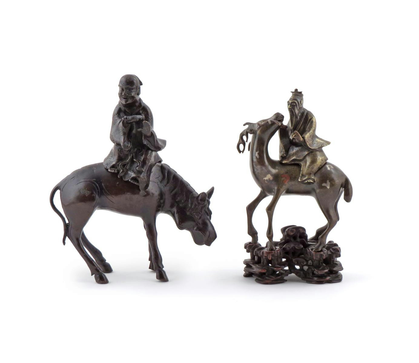 Two Chinese bronze incense burners 17th century and later, each modelled as a sage, one riding a mule, the other a deer and inlaid with silver wire, the latter with a hardwood stand carved with lingzhi, 23.8cm max. (5)