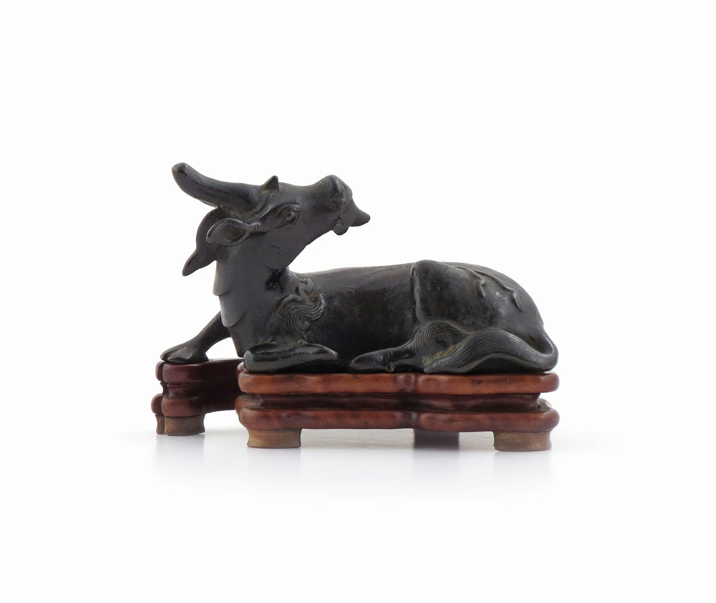 A Chinese bronze model of a recumbent kylin late Ming dynasty, its head turned over its back, its hooves tucked neatly beneath its body, together with a hardwood stand, 18cm. (2)