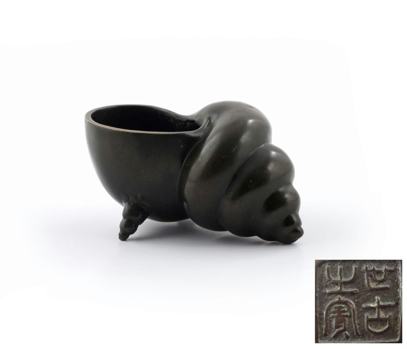 A Japanese bronze incense burner Meiji 1868-1912, formed as a large conch shell with two smaller shells as short feet, the base with a four character mark, 15cm.