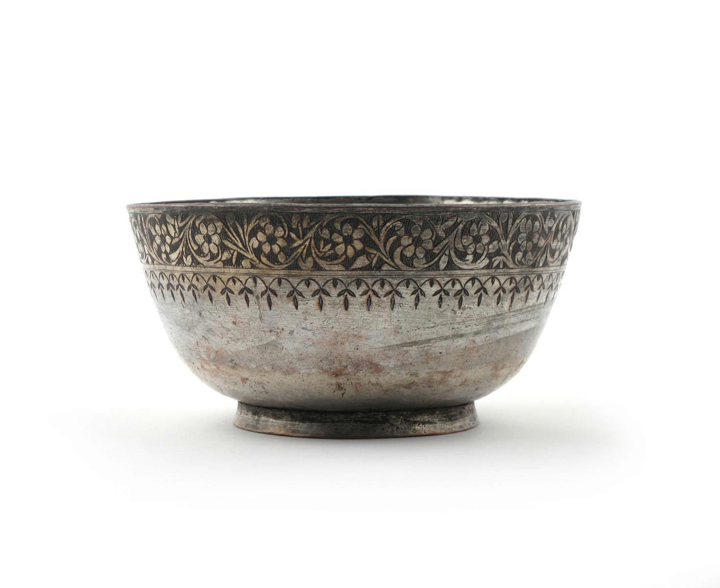 A Middle Eastern silvered copper bowl 19th century or earlier, the U-shaped body raised on a short flared foot and decorated with a scrolling foliate design, 18.5cm.