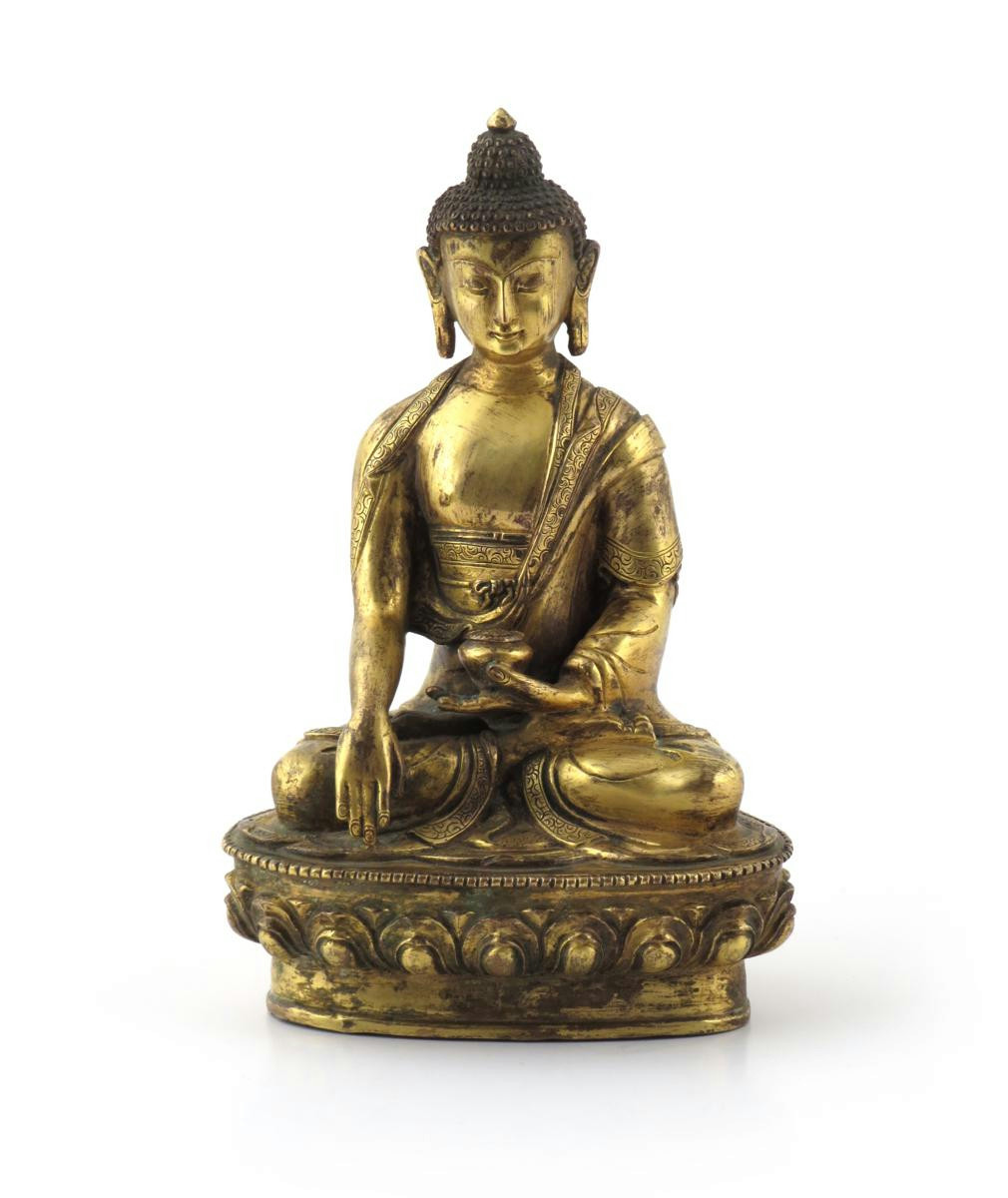 A Chinese gilt bronze model of Buddha 18th century or later, seated on a lotus base, holding a small bowl in his left hand, his robes edged with scrollwork, 21cm.