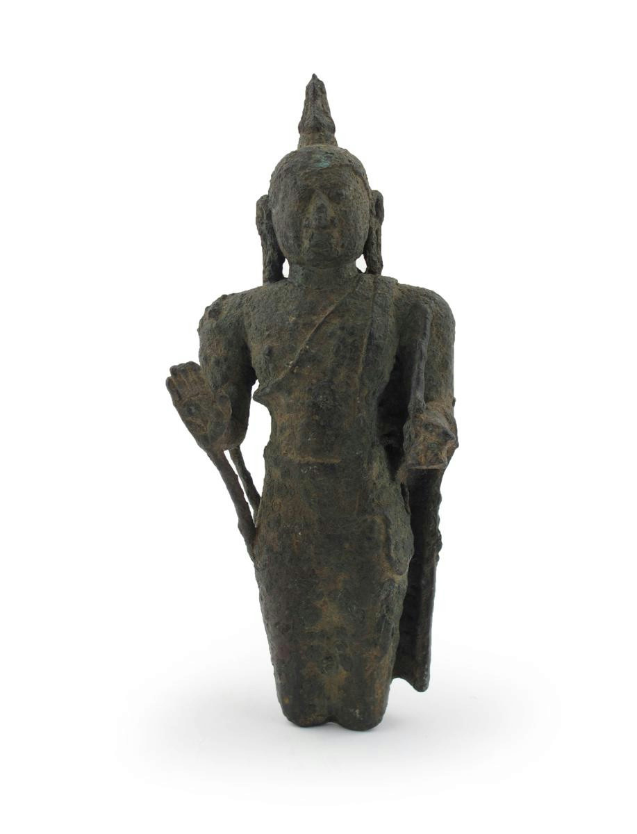 A Sri Lankan bronze figure 18th century or earlier, standing, his right hand supported by two struts, both palms extended in front, and wearing a tall pointed headdress, 19.6cm.