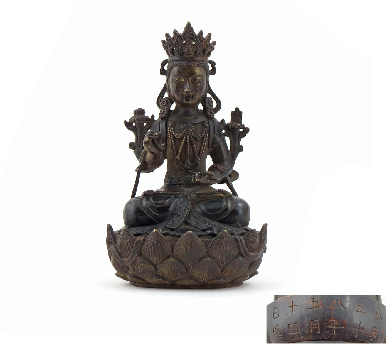A Chinese bronze model of Guanyin 19th or 20th century, raised on a lotus petal throne, the reverse with a twelve character mark, purportedly corresponding to the twenty-eighth year of Yongle, 24.9cm.