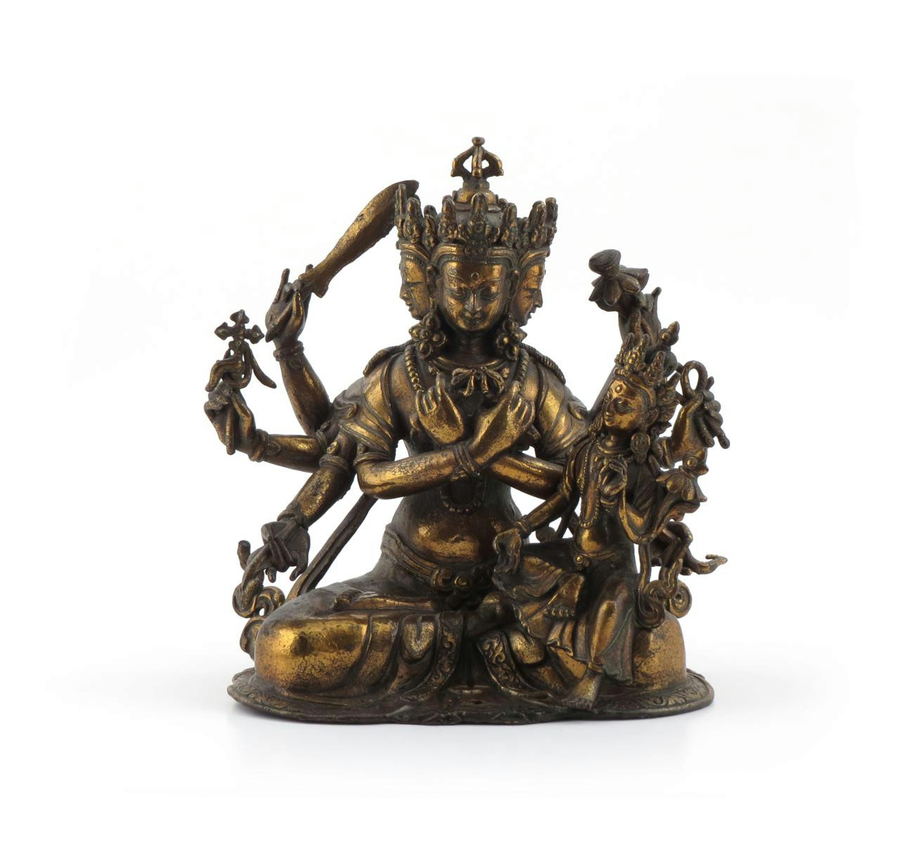 A Chinese gilt bronze model of Vijaya 20th century, the four-faced, eight-armed deity sitting holding various attributes, including a flaming sword and a pair of vajra, a smaller figure of Tara seated on her left knee, both adorned with necklaces and ribbons, 26cm high.