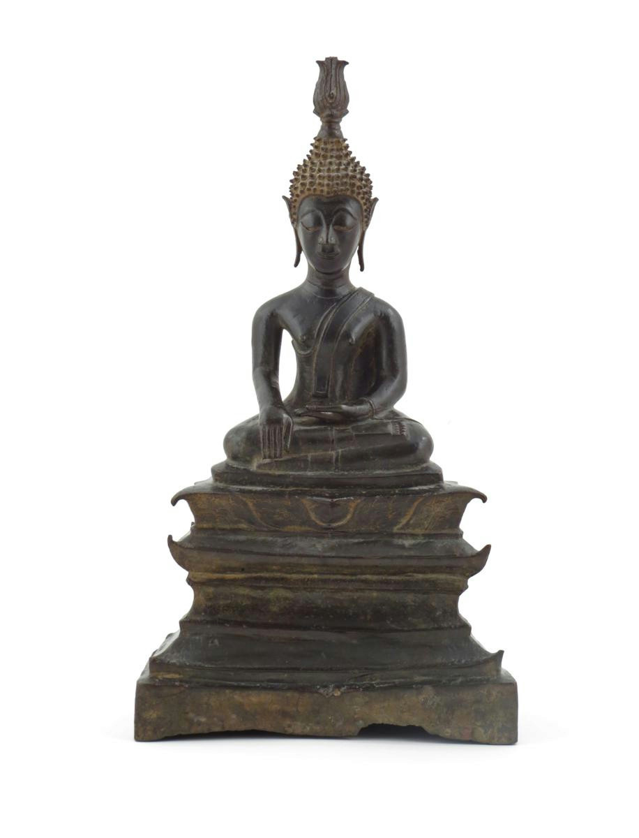 A large Thai bronze model of Buddha 19th century, seated on a high stepped plinth, with an elaborate headdress and a serene expression, 43.5cm.