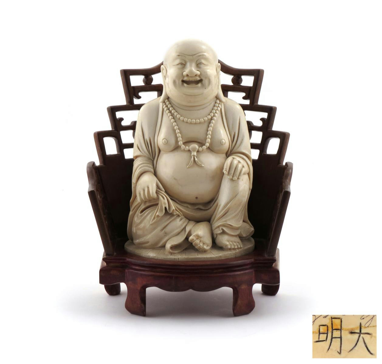 A large Chinese ivory carving of Budai He Shang c.1900, seated with his robes open to reveal his large belly, a string of prayer beads about his neck, a laughing expression on his face, together with a hardwood stand carved as a high-backed throne, 23.2cm. (2)