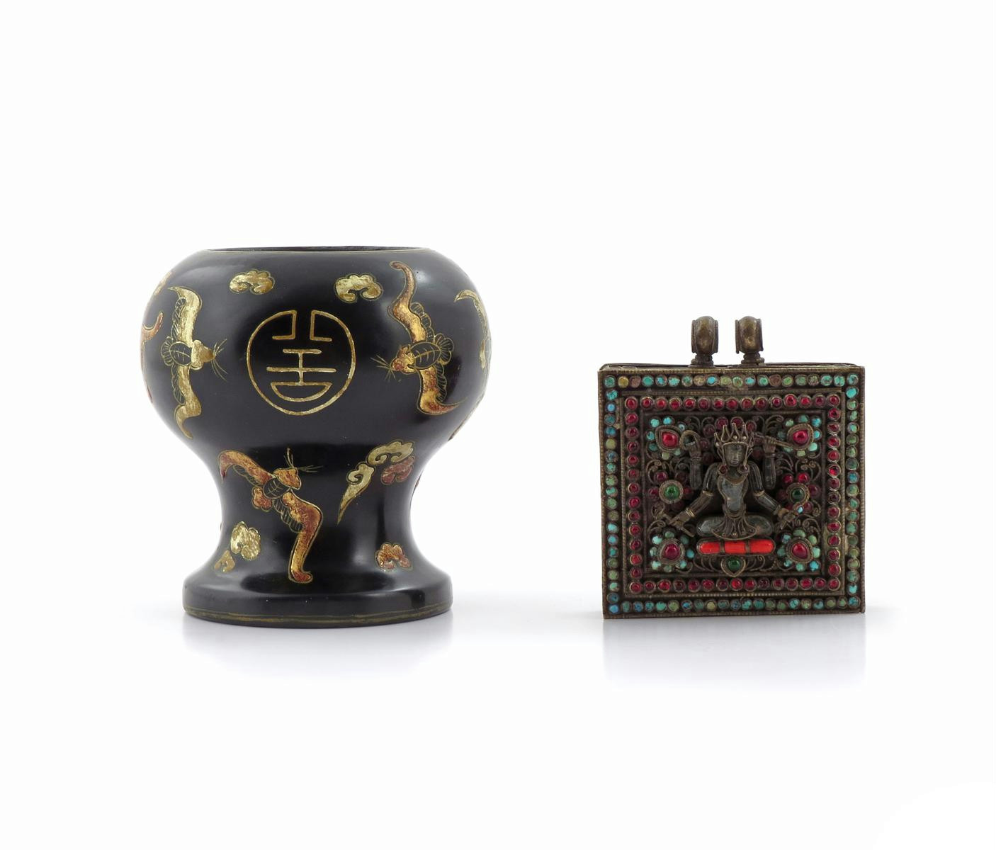 A Chinese black lacquer stem bowl 19th century, decorated in gilt with bats, shou characters and clouds, the base with a four character Kangxi mark, and a Tibetan gilt metal box, the hinged cover decorated with coloured stones, the interior containing a prayer, 11cm max. (3)