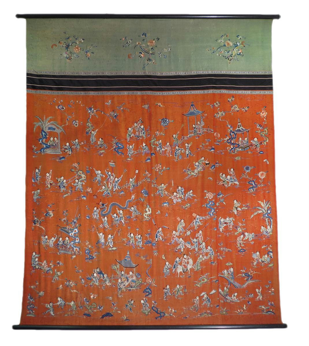 A large Chinese silk embroidered panel 19th century, decorated with many figures playing games, music, and enjoying festivities, reserved on a red ground, beneath a wide green band decorated with a basket of flowers and a bat, 229cm x 186cm.