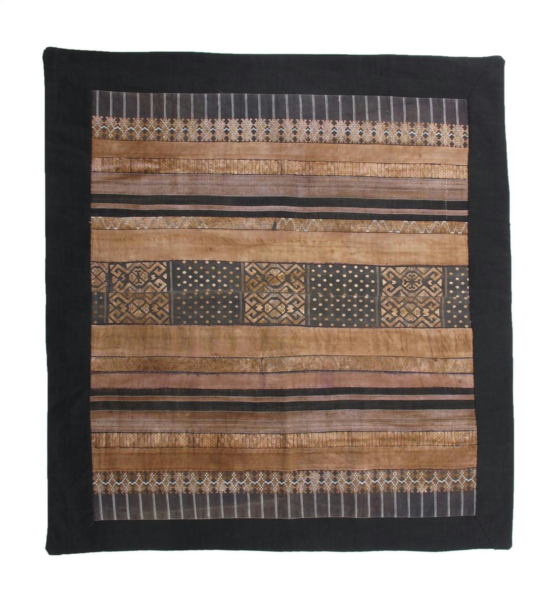 Two Chinese embroidered panels early 20th century, decorated in gold and white with geometric bands on a grey ground, mounted in black, 47cm x 38.5cm. (2)