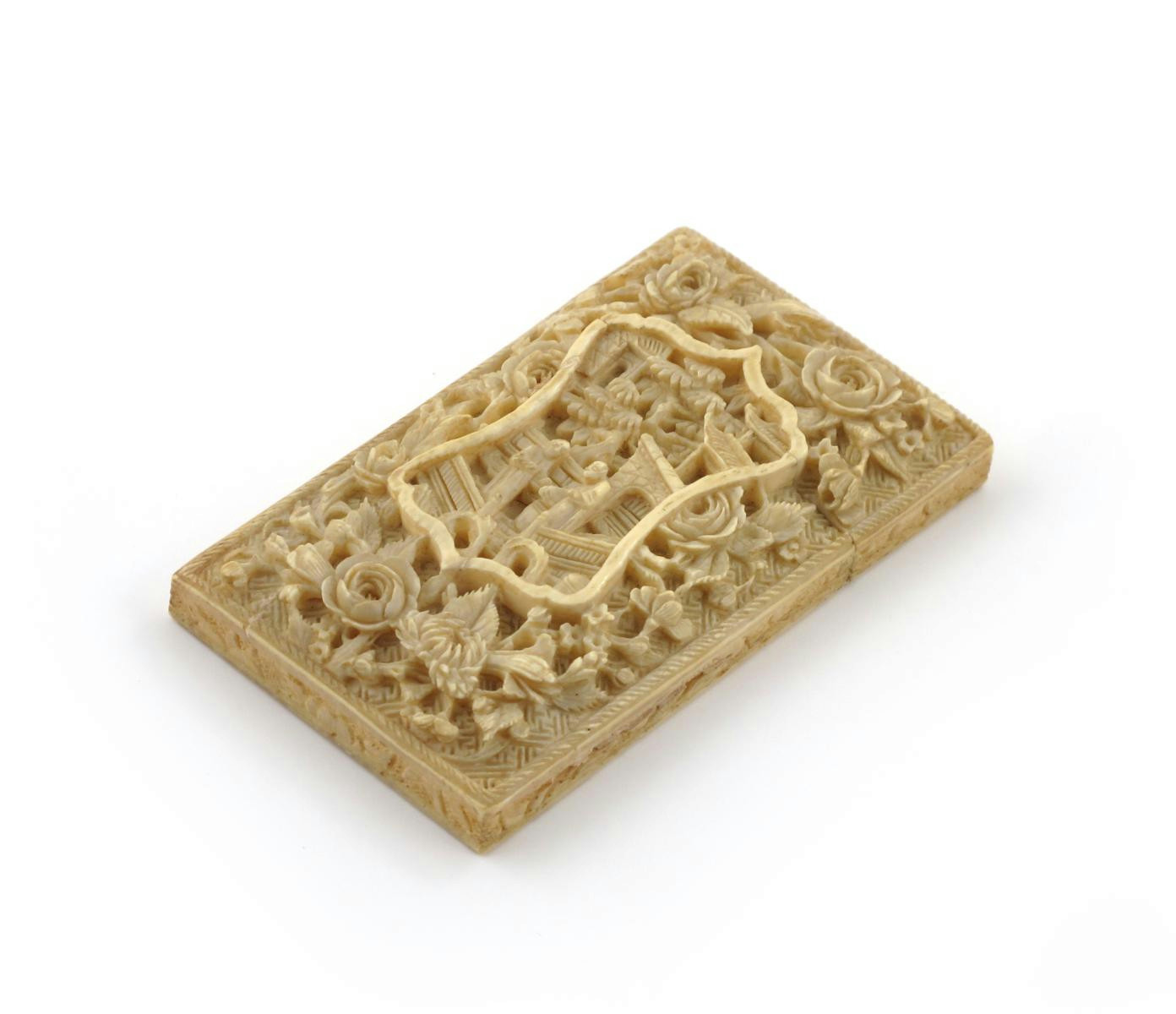 λ A Chinese Canton ivory card case 19th century, carved with a shaped panel containing figures beside a pagoda beneath pine, the border with a scrolling floral design, the reverse with further figures, 9.8cm. (2)