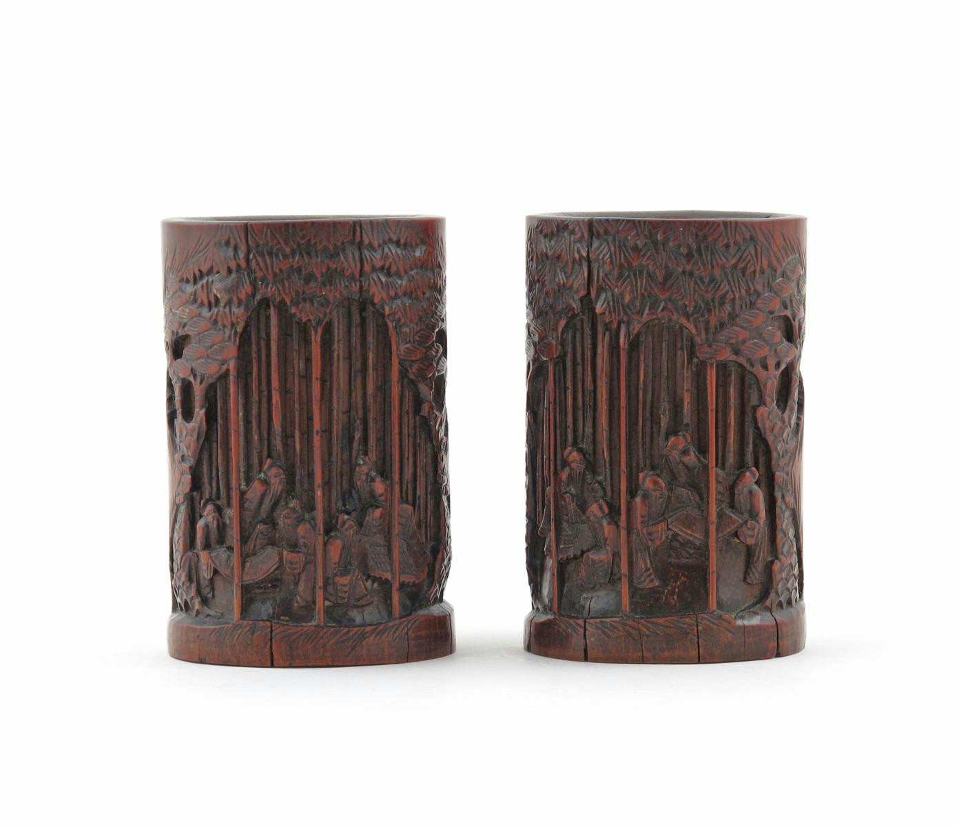 A pair of Chinese bamboo bitong 19th century, each carved with five scholars examining scrolls in a bamboo grove, 14.2cm. (2)
