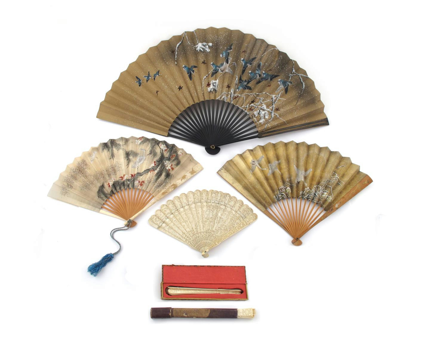 λ Three Chinese Canton ivory brisé fans 19th century, finely carved and reticulated with figures, dragons, pagodas, auspicious objects and scrolling foliate designs, and three Japanese wood and paper fans, painted with birds, 72.5cm across max. (6)