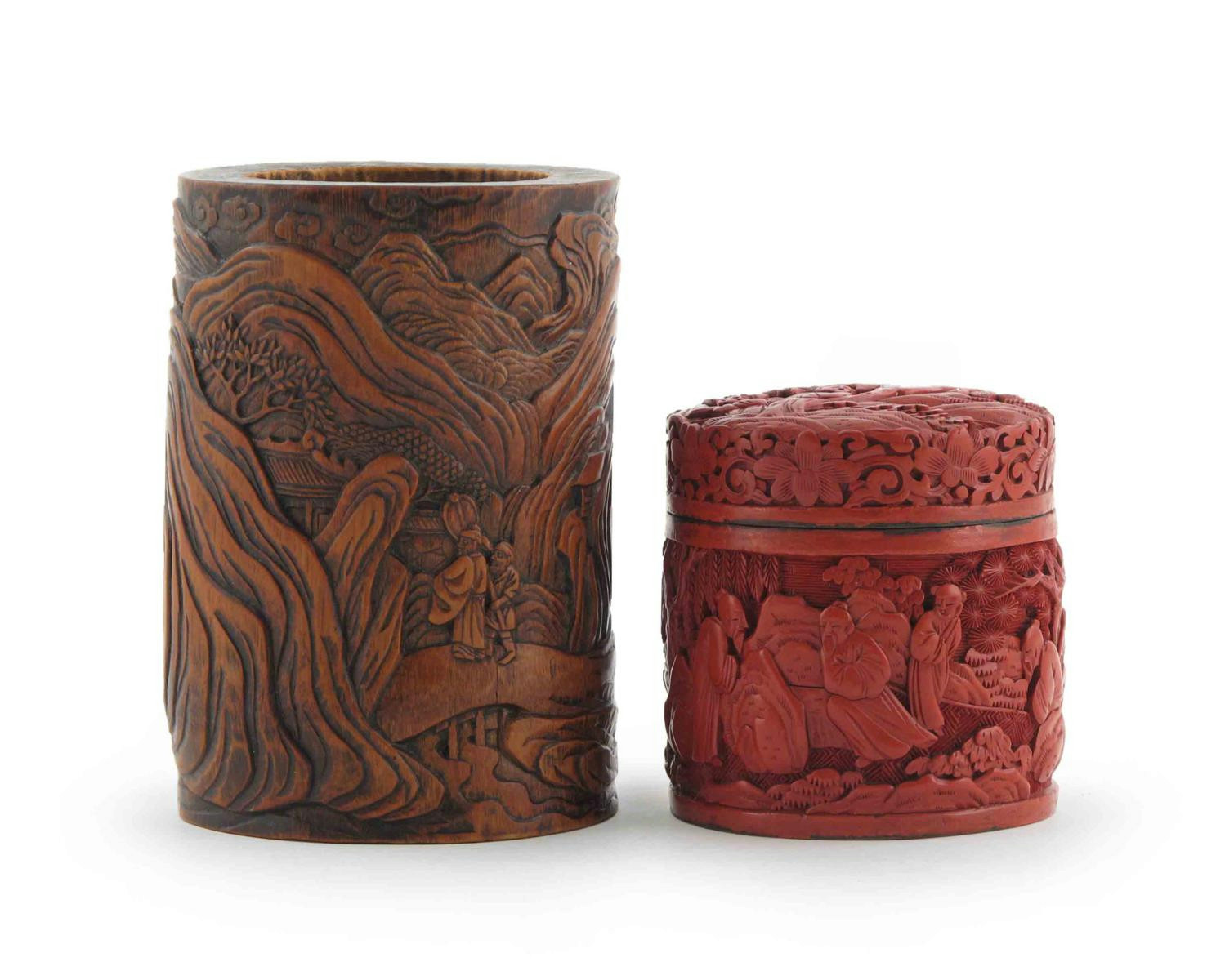 A Chinese bamboo bitong c.1900, carved in relief with figures in a mountainous landscape, and a Chinese red cinnabar lacquer cylindrical box and cover, 13.5cm. (3)