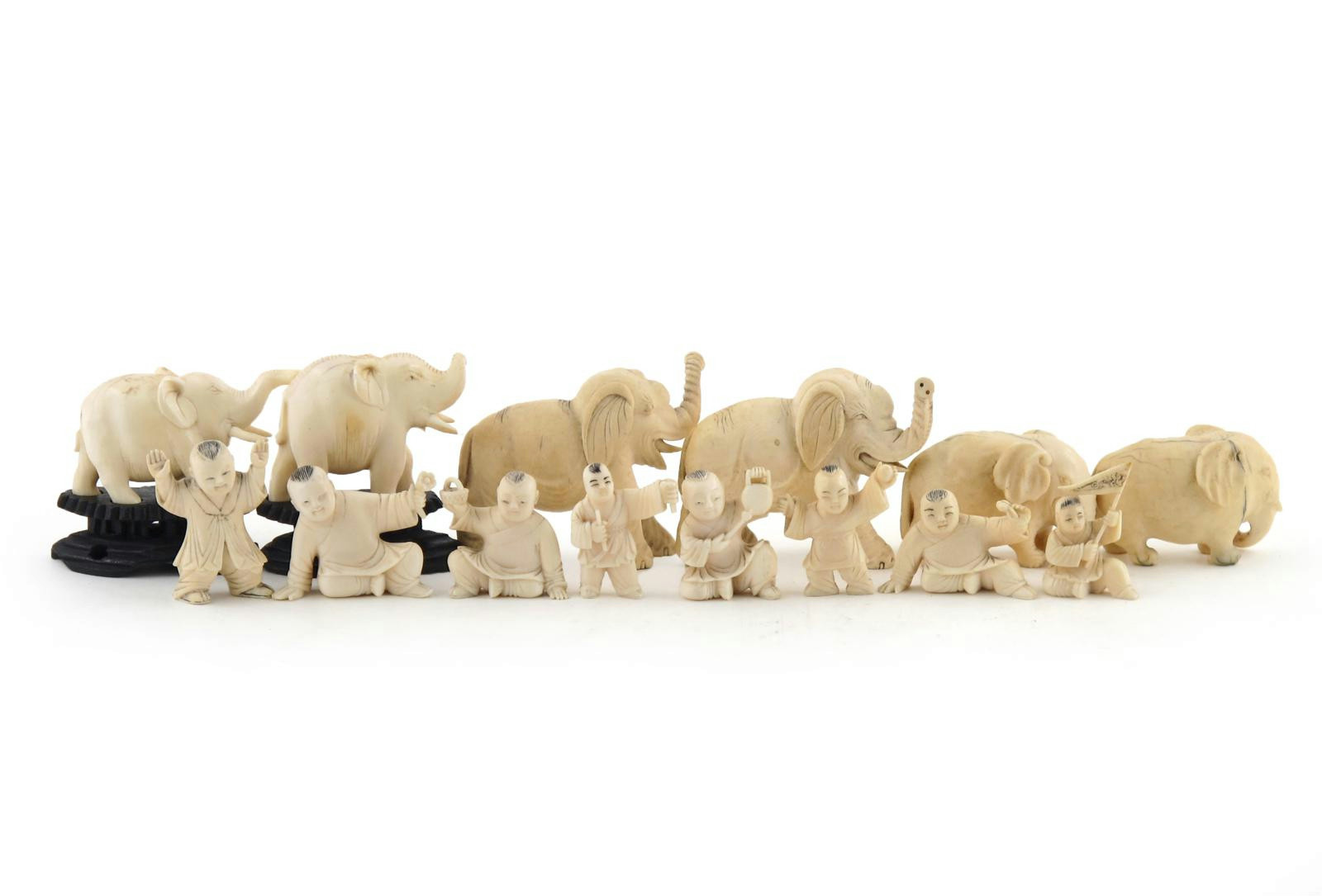 λ Three pairs of Chinese ivory carvings of elephants 19th/early 20th century, two with hardwood stands, and eight small ivory carvings of boys engaged in various pursuits, 8cm max. (16)