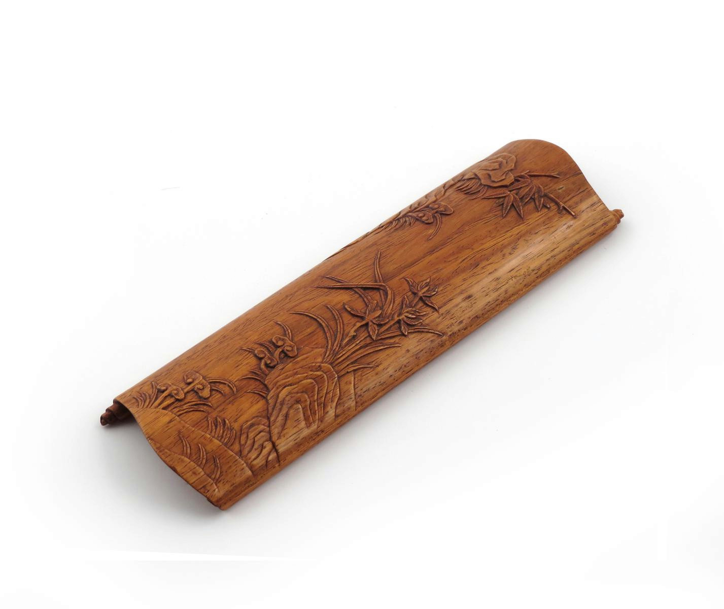A Chinese huanghuali wrist rest 18th century or later, simulating an open scroll and carved in relief to one side with lingzhi and bamboo emerging from rockwork, 20.5cm.