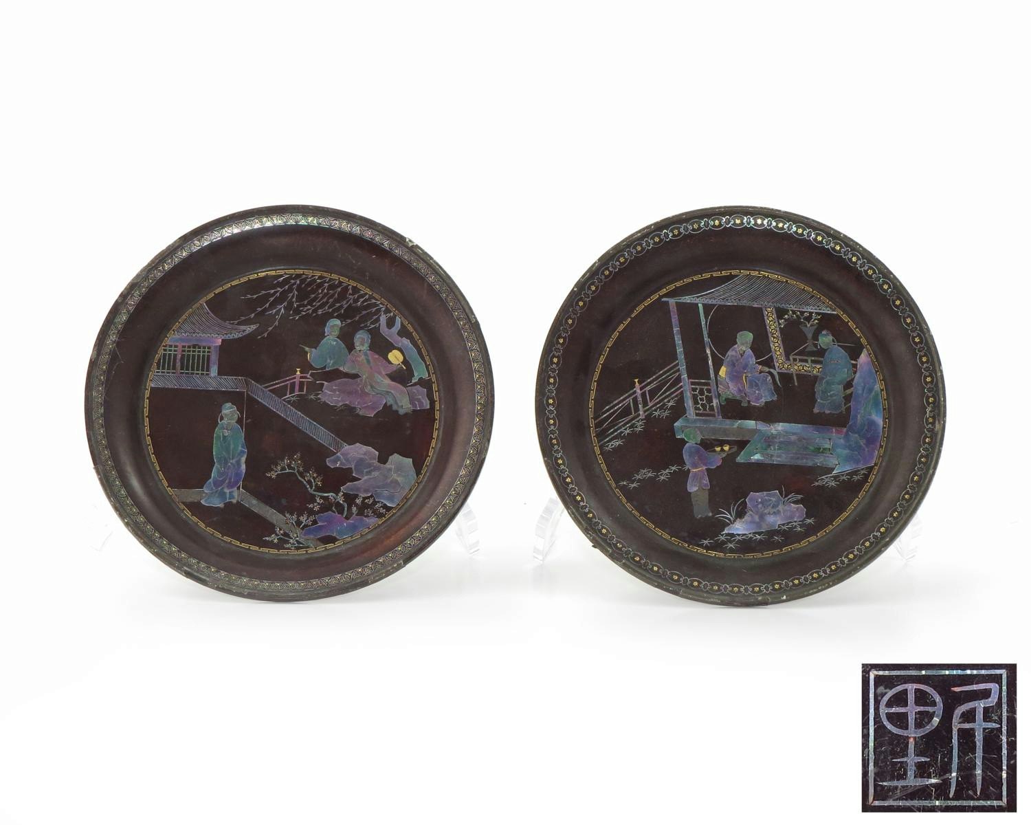A pair of Chinese laque burgauté dishes 18th century, each inlaid with mother of pearl, depicting scenes from The Romance of the Western Chamber, with figures in rocky fenced gardens, a narrow geometric band to the rim, each with a mark which reads qian li, 12.4cm. (2)