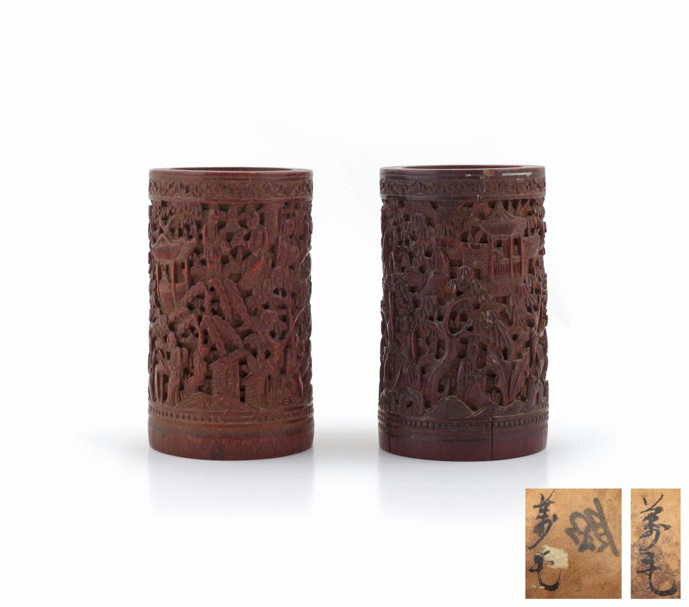 A pair of Chinese bamboo bitong 19th century, carved in relief with figures and pagodas amidst pine, willow and plantain, 13cm. (2)