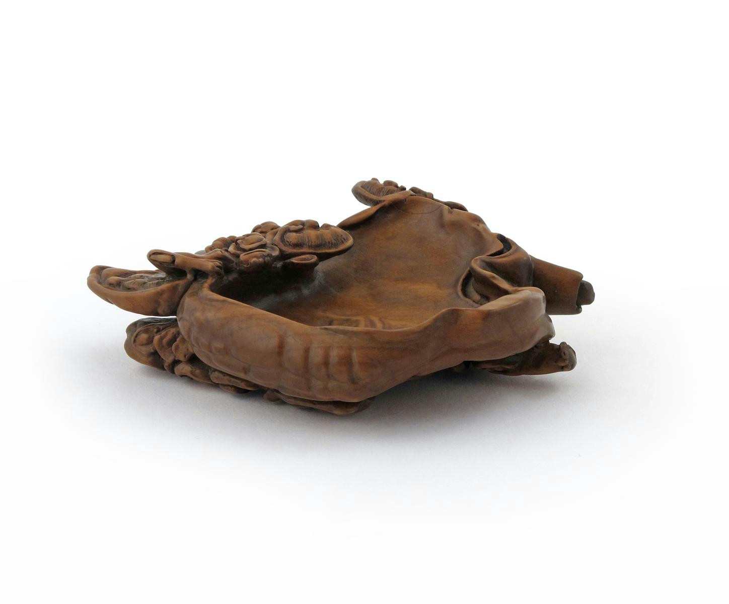 A Chinese hardwood brush washer 20th century, carved as lingzhi fungus emerging from a gnarled branch, 13.2cm.