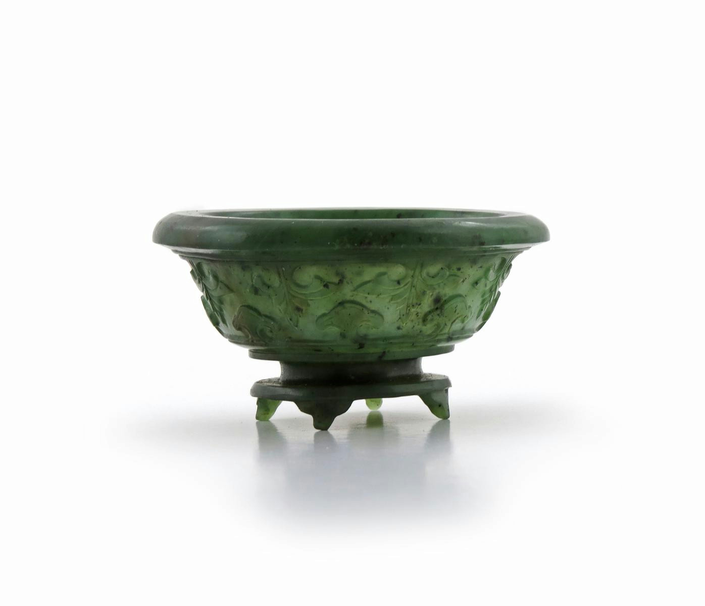 A small Chinese Moghul spinach-green jade bowl probably 19th century, the exterior crisply carved with a stylized leaf band, the flared base with four feet, 5.5cm.