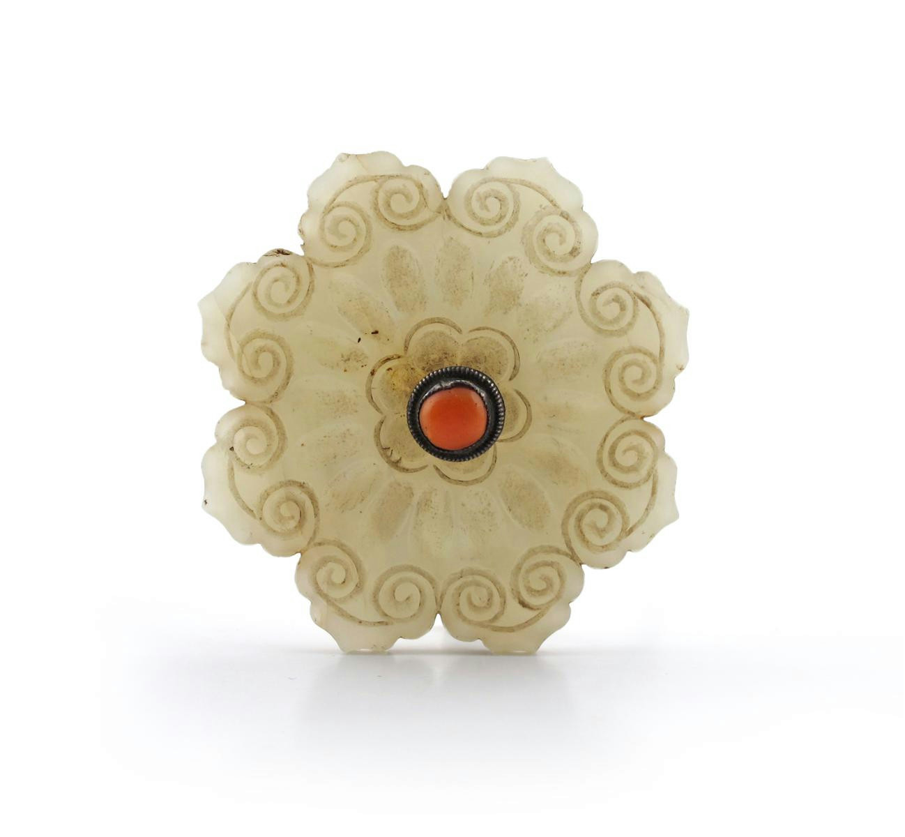 λ A Chinese celadon jade plaque 19th century, formed as a lobed flower and carved with ruyi-heads, the reverse with a swirling petal design, with a metal fitting mounted with a coral bead, 6.3cm. (2)