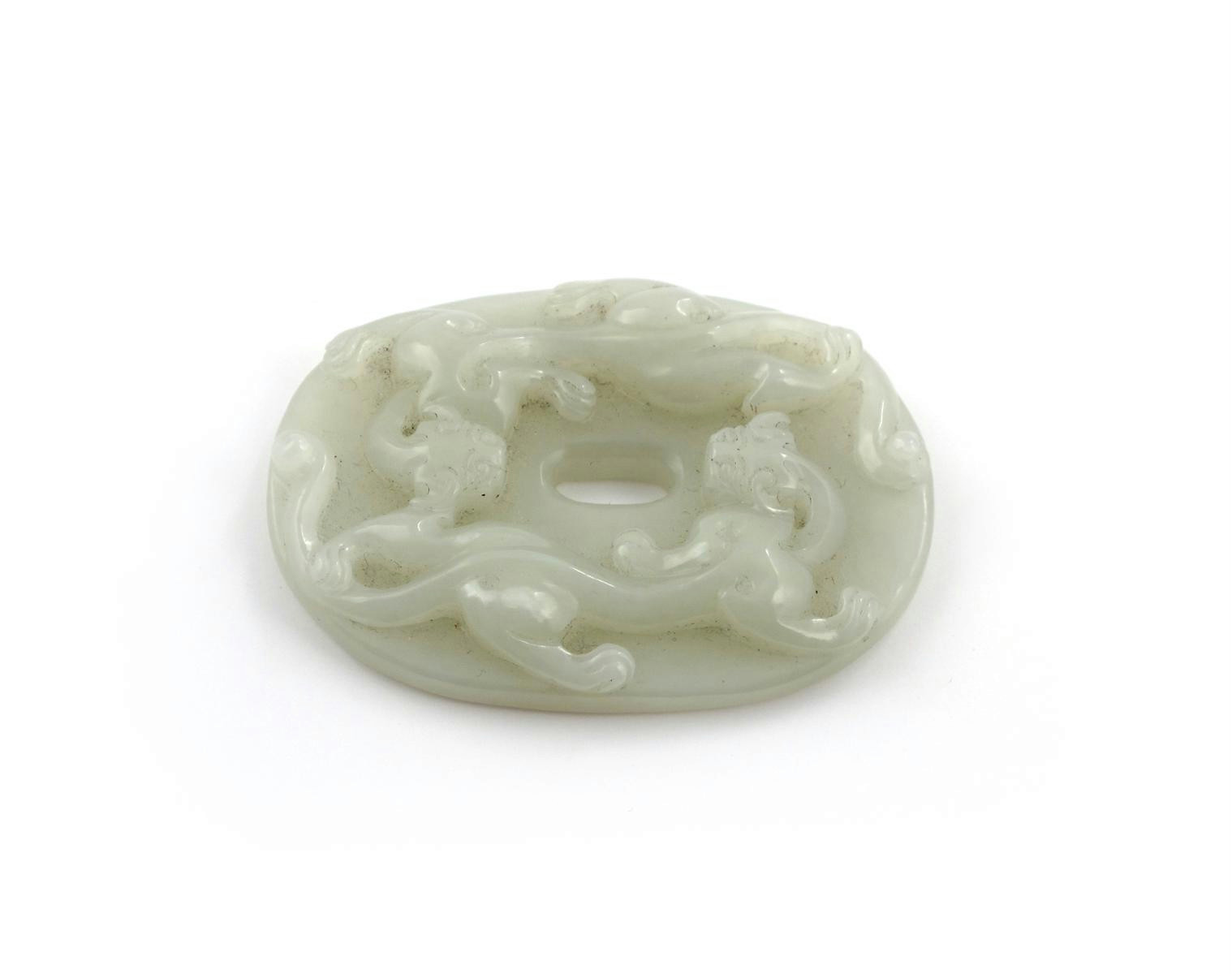 A Chinese pale celadon jade oval plaque 20th century, carved in relief to one side with two sinuous chilong, 6.5cm.