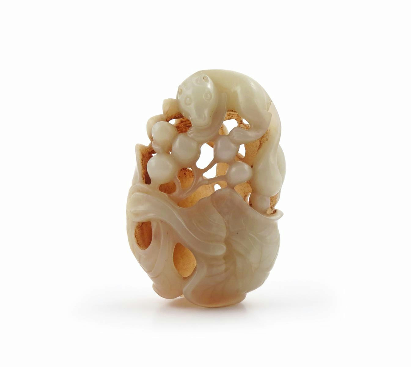 A Chinese pale celadon jade reticulated carving of two squirrels, clambering on berries, with large mallow leaves beneath, 7.7cm.