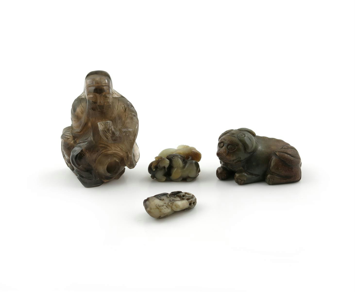 Two Chinese celadon jade carvings 19th century, one carved as three huddled recumbent goats, the other a gourd, together with a hardstone carving of a Buddhist lion dog, and a smokey rock crystal carving of a bearded figure seated on a pot, 10cm. (4)