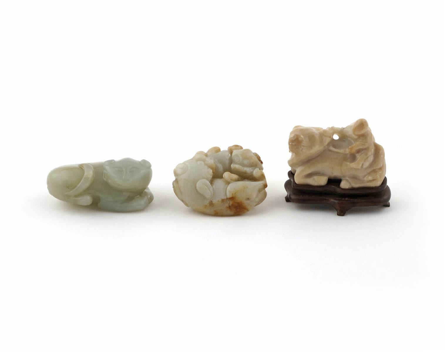 Three Chinese jade carvings 19th/20th century, one formed as two Buddhist lion dogs playing, another a recumbent cat, the third a buffalo with a boy on its back, holding the beast's horn, the stones in celadon and creamy-russet tones, the latter with a hardwood stand, 6.1cm max. (4)