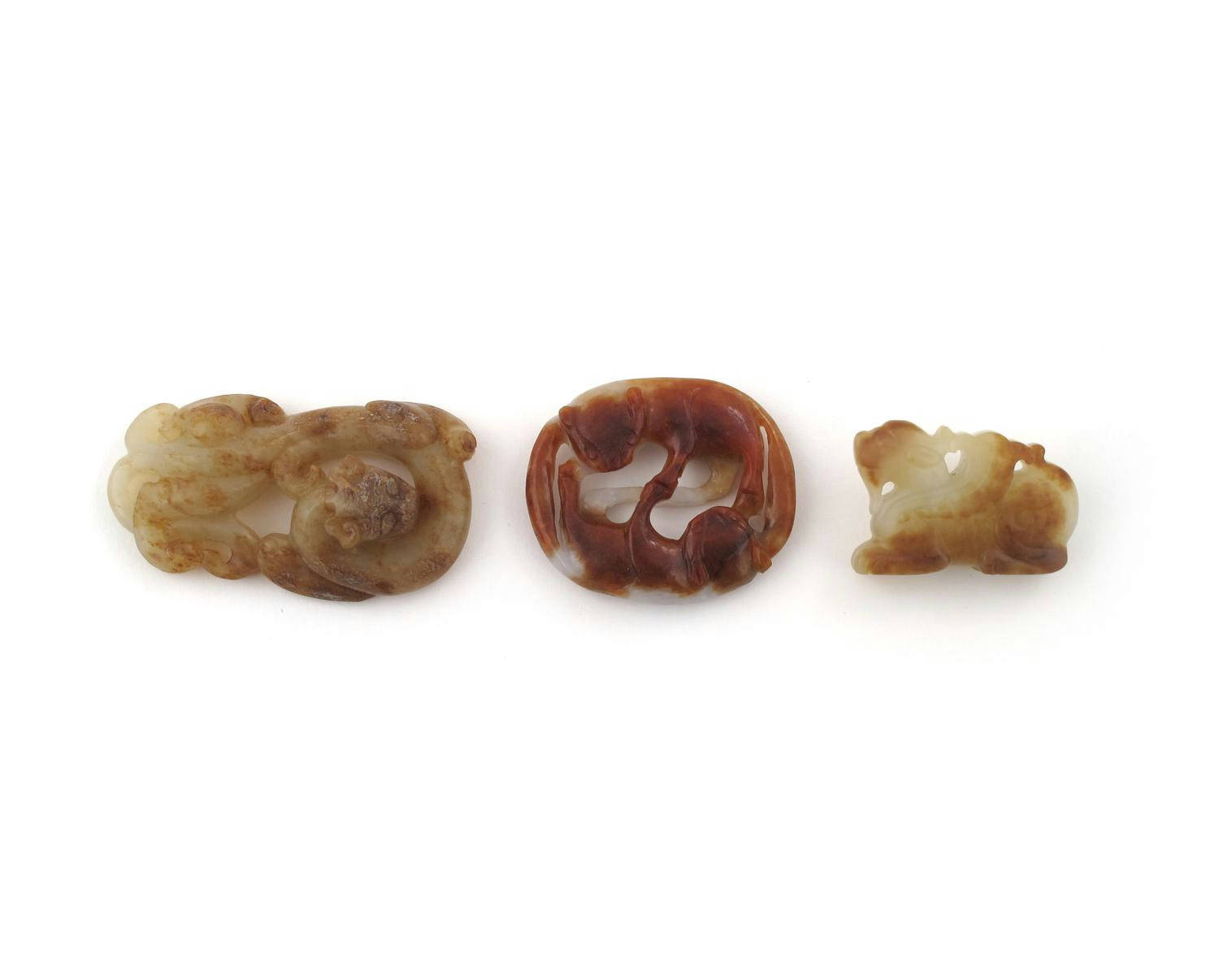 Three Chinese celadon jade carvings 19th or 20th century, one carved as two recumbent cats, another a crouching mythical beast, the third a sinuous chilong, the stones with russet-brown markings, 6.5cm max. (3)