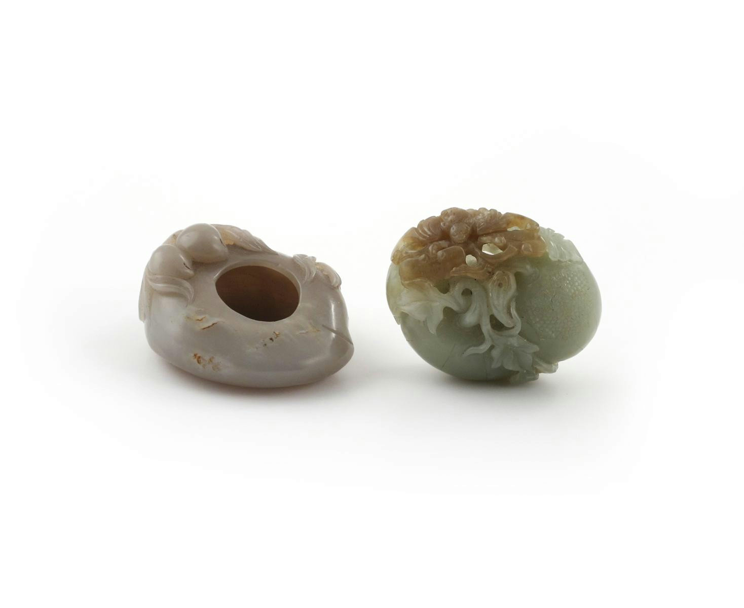 Two Chinese jade carvings 19th century, one a brush washer formed as a peach, with smaller fruits issuing from a leafy stem, the other carved with two large fruits, with lingzhi fungus to one side, and a bat perched on a foliate branch, 6.7cm. (2)