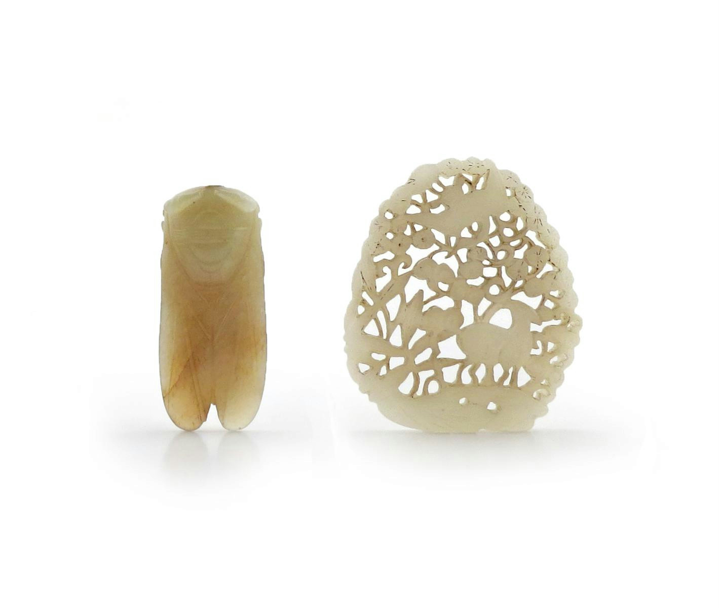Two Chinese jade carvings probably 19th century, one formed as a stylized cicada, the other a reticulated plaque with a deer and a crane in a flowering tree, the stones in celadon and russet, 7cm. (2)
