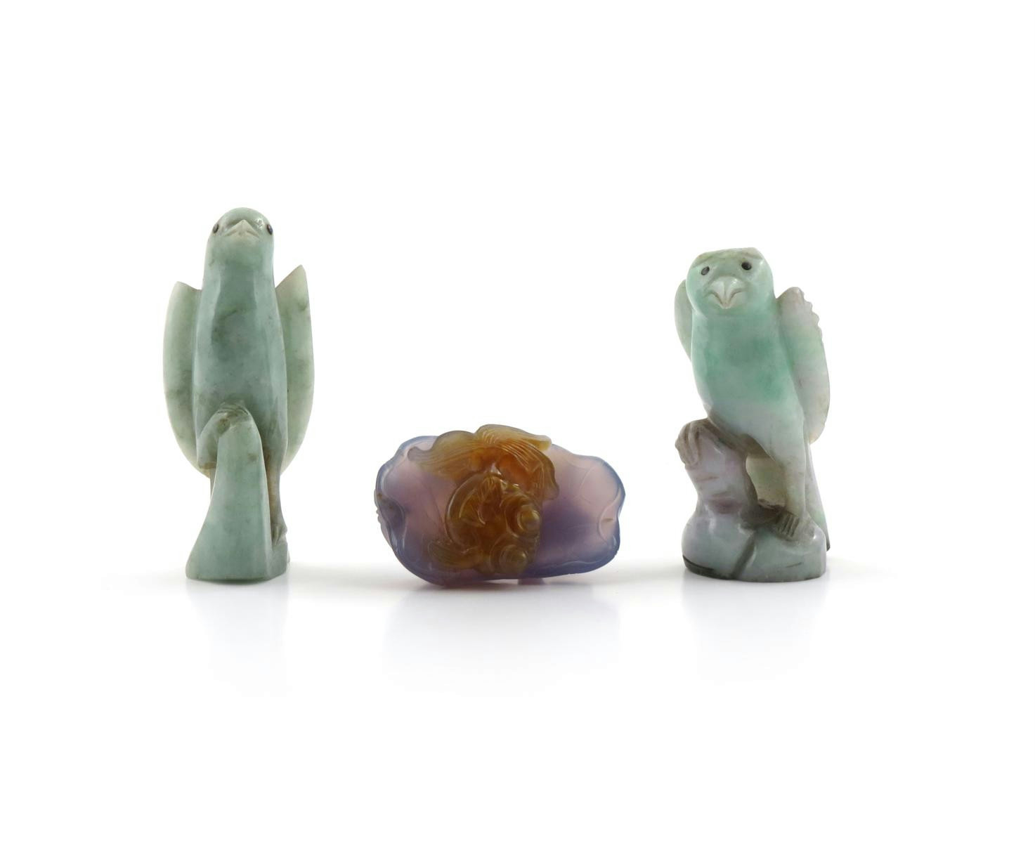 A Chinese agate carving of a moor fish 20th century, hiding beneath a lotus leaf, together with two jadeite carvings of hawks, 6cm. (3)