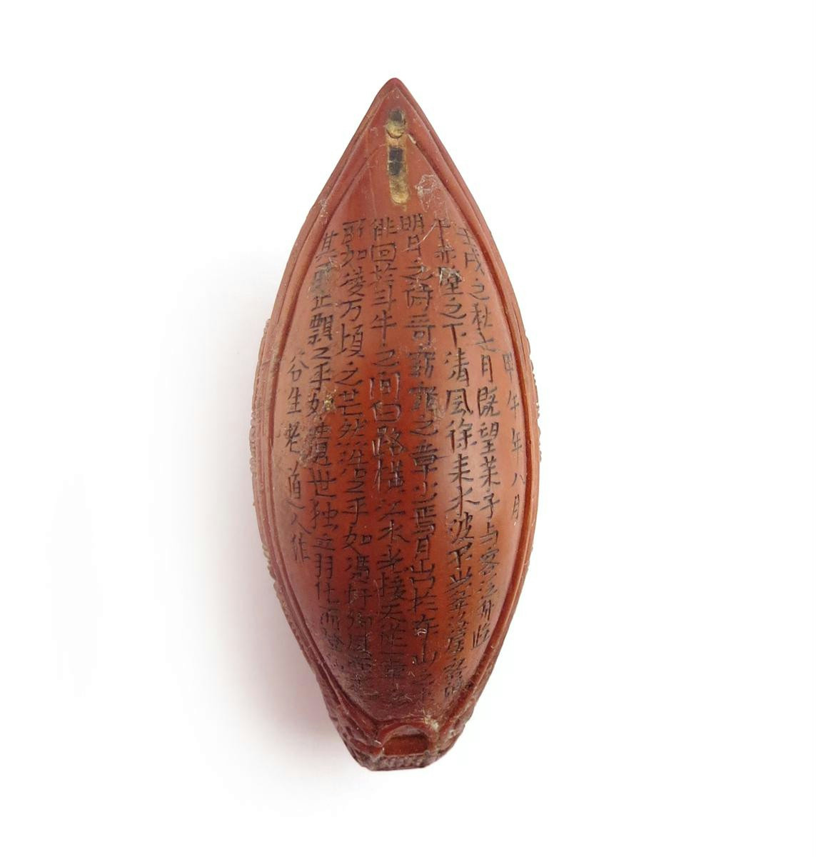 A small Chinese pale celadon jade carving of two cats 19th century, one with a brocade ball between its paws, a large lingzhi spray between them, a pair of glass opium pipe rests modelled as Buddhist lion dogs, an ivory carving of a sage standing with a tall staff, and a miniature model of a boat, inscribed with calligraphy to the base and carved from a fruit's stone, 13.2cm max. (5)